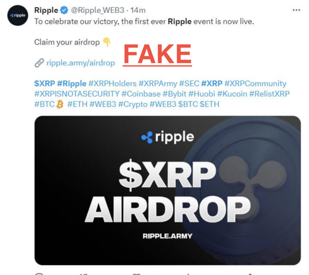 حذّرت شركة ريبل من عمليات الاحتيال التي تستغل نجاحها الأخير في صراعها مع هيئة الأوراق المالية والبورصات الأمريكية (SEC). حيث أفادت بأن مجموعة من الأشخاص يحاولون استغلال الإشاعات الإيجابية المحيطة بالشركة لنشر روابط صيد لمشاريع جوائز مزيفة.