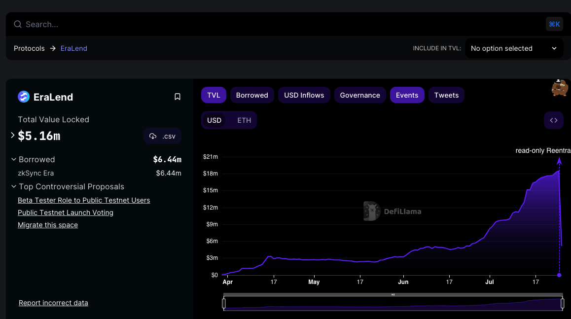 EraLend، أكبر بروتوكول إقراض للعملة المشفرة في zkSync Era من حيث القيمة الإجمالية المقفلة (TVL)، تعرض إلى اختراق أمني كلف خزائنه أكثر من 3.4 مليون دولار. وفقًا لبيانات البروتوكول على DefiLlama، فقد EraLend أكثر من 65٪ من قميتها الإجمالية المقفلة TVL. حيث انهارت من 18.51 مليون دولار إلى 6.44 مليون دولار في 24 ساعة.