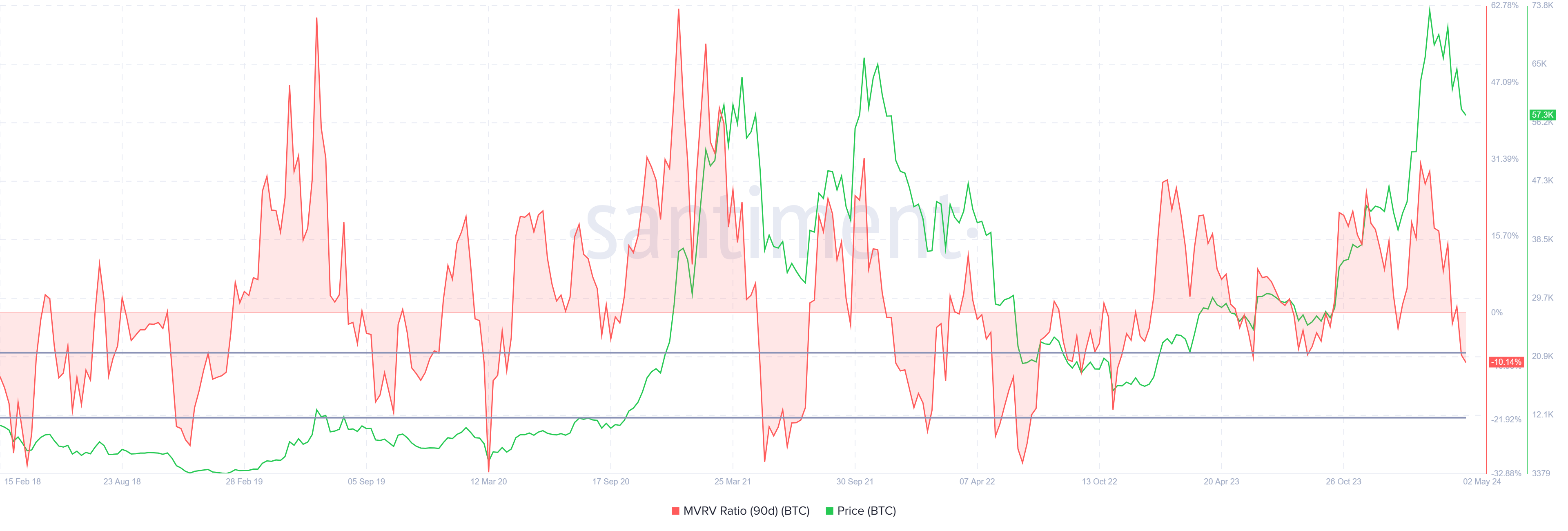 نسبة MVRV للبيتكوين لمدة 90 يوما. المصدر: سانتيمنت
