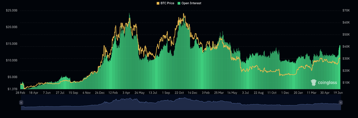 زادت أحجام العقود المستقبلية المفتوحة والتي تسمى الفائدة المفتوحة open interest. أو إجمالي عدد العقود التي لم يتم تسويتها وتصفيتها، في عقود البيتكوين المستقبلية إلى أكثر من 14.61 مليار دولار يوم 27 يونيو. لتصل إلى أعلى مستوى لها منذ يونيو من العام الماضي حسب بيانات Coinglass. في عز شتاء الكريبتو وانهيار شركات وأسعار العملات الرقمية.