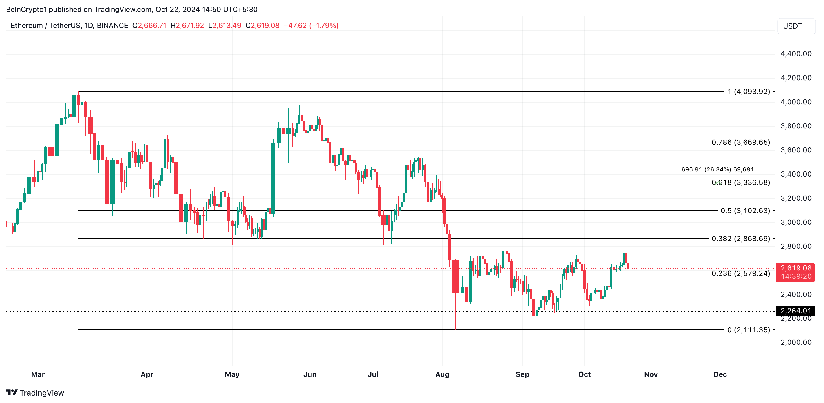 يتداول الإيثريوم حاليًا بسعر 2 619 دولارًا، ويحوم فوق مستوى الدعم الرئيسي عند 2 579 دولارًا. إذا تباطأت الأنشطة السوقية وضعف الطلب على العملة البديلة، فقد يجد المضاربون على الارتفاع صعوبة في الحفاظ على هذا الدعم. قد ينخفض سعر ETH نحو المستوى التالي الرئيسي للدعم عند 2 264 دولارًا في مثل هذا السيناريو.