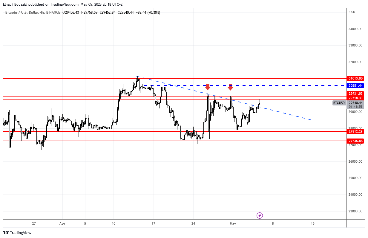 منذ بلوغ سعر البيتكوين ذروته هذا العام عند 31170 دولار و هو يتحرك خط اتجاه هابط كما هو موضح في الرسم البياني المرفق. السعر في هذه المدة اختبر مستوى المقاومة 29930 في ثلاث مناسبات و لكنه فشل في اختراقها.