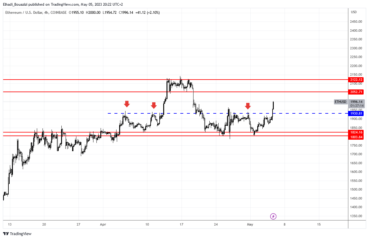 سعر ايثيريوم ارتفاع بحدة أكبر من البيتكوين بعد صدور البيانات التوظيف. حيث تمكن من اختراق مستوى المقاومة 1930 دولار. الذي كان يتداول تحته منذ أسبوعين و نصف.