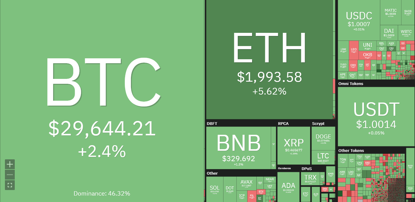 Sponsoredوفي قت كتابة هذا التقرير كان سعر البيتكوين مرتفع بنسبة 2.4% خلال الـ 24 ساعة الماضية إلى 29,644 دولار. بعد أن كان يتداول في حدود المستوى 29,100 دولار قبل صدور تقرير الوظائف. على الرغم من أنه لا يزال دون مستوى 30,000 دولار. كما ارتفع سعر عملة إيثيريوم 5.65% ليبلغ 1993 دولار.