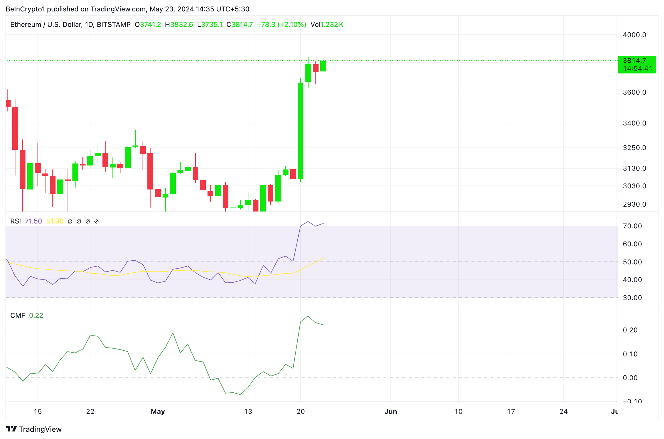 علاوة على ذلك ، استقر Chaikin Money (CMF) الخاص بالعملة ، والذي يتتبع تدفق السيولة داخل وخارج سوق ETH ، فوق خط الصفر المركزي عند 0.22.