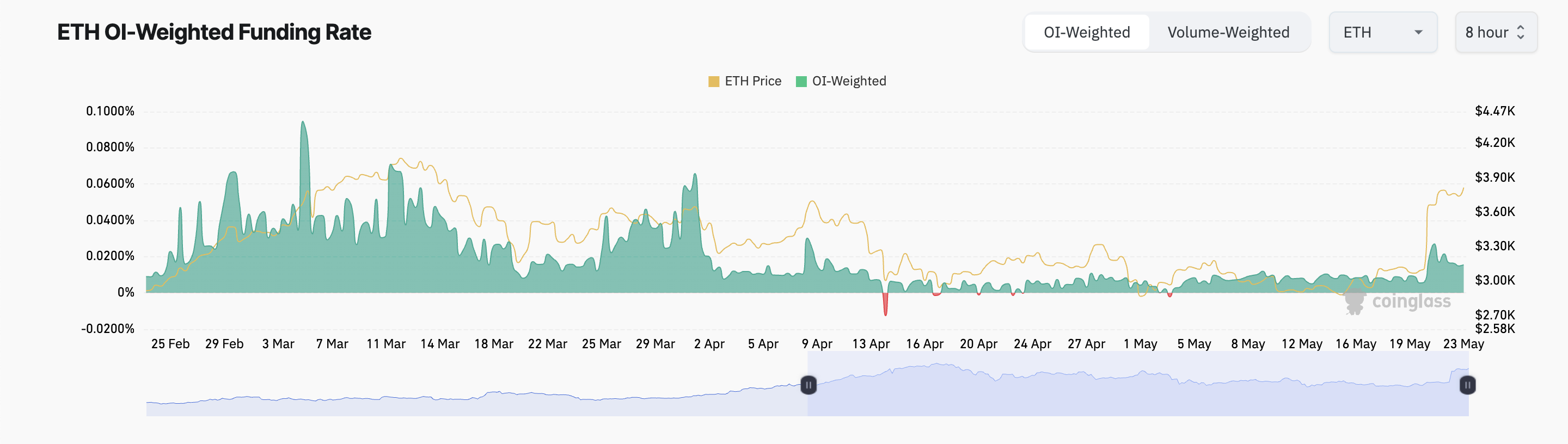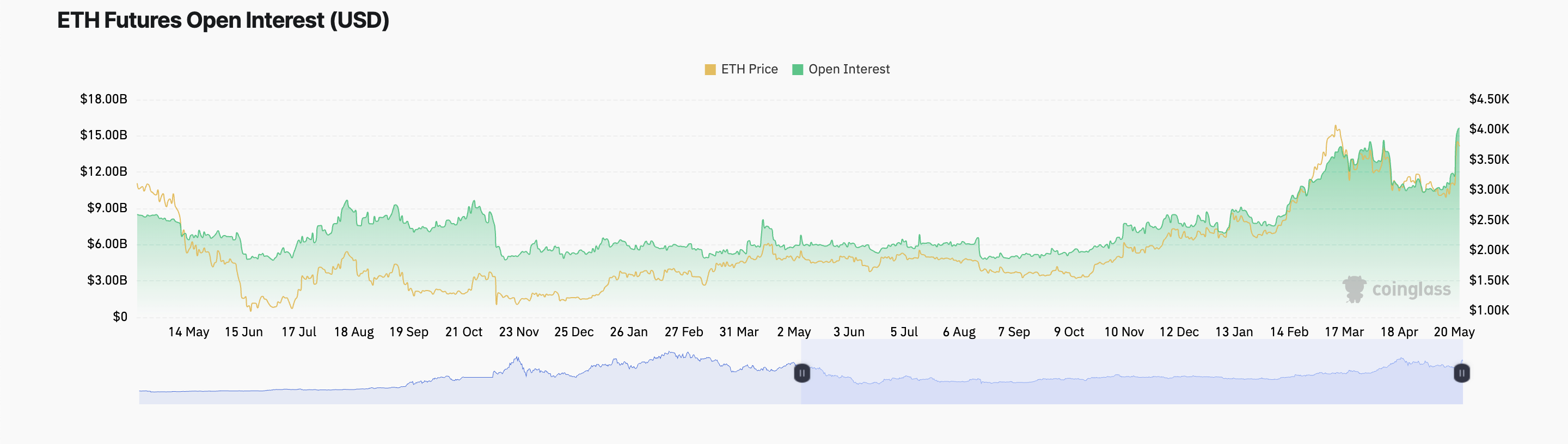 حتى كتابة هذه السطور، كانت الفائدة المفتوحة للعقود الآجلة لـ ETH 16 مليار دولار. بدأ اتجاهه الصعودي الأخير في 19 مايو وارتفع منذ ذلك الحين بنسبة 45٪.