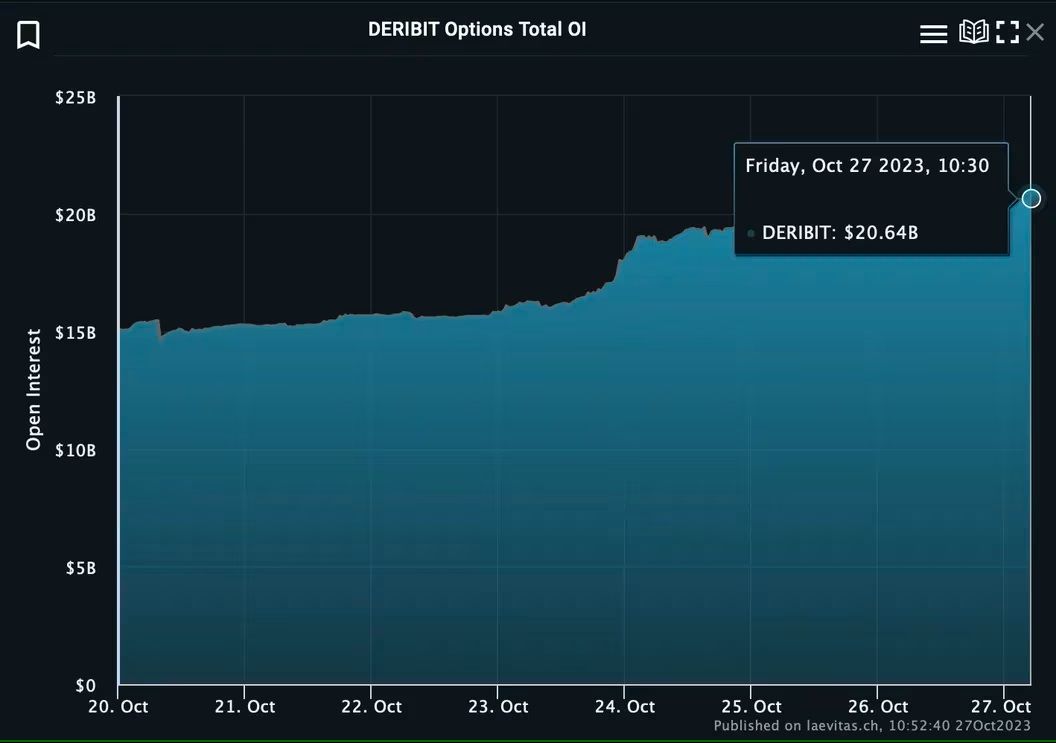 تشير البيانات شركة Laevitas السويسرية إلى أن القيمة الاستثمارية الاسمية للعقود لخيارات البيتكوين والإيثريوم المفتوحة على منصة تداول المشتقات على العملات المشفرة الرائدة Deribit قد ارتفعت إلى 20.64 مليار دولار.