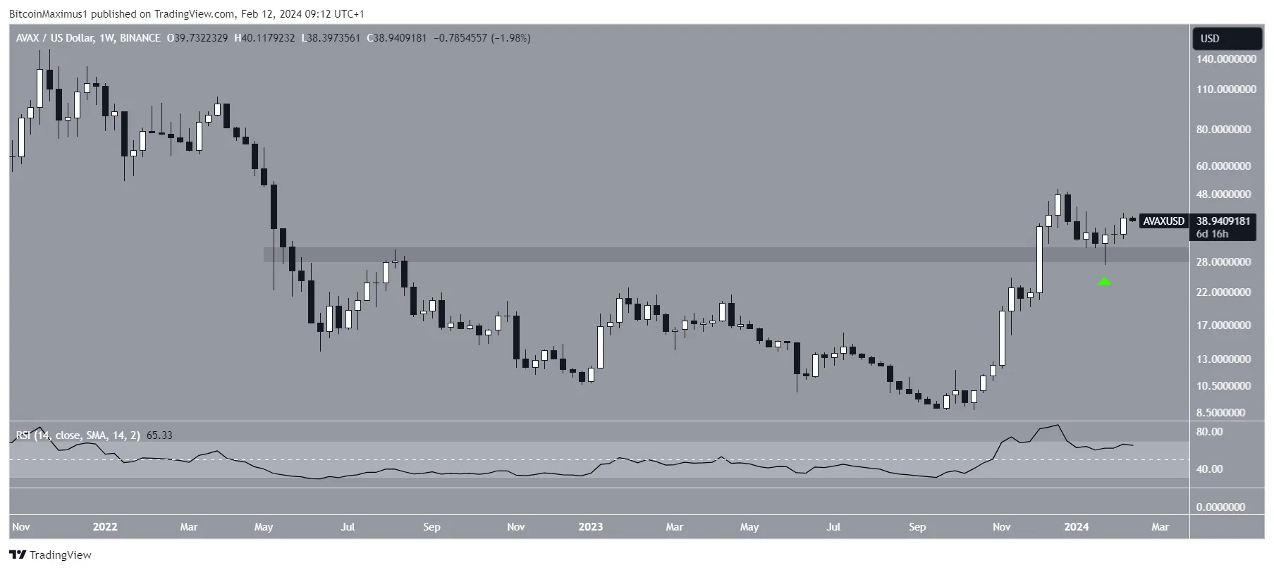 أنشأت AVAX شمعة أسبوعية صعودية (أيقونة خضراء)، لتحفيز الزيادة الحالية. ولم يخترق السعر أعلى مستوى في 2023 على الرغم من الحركة الصعودية.