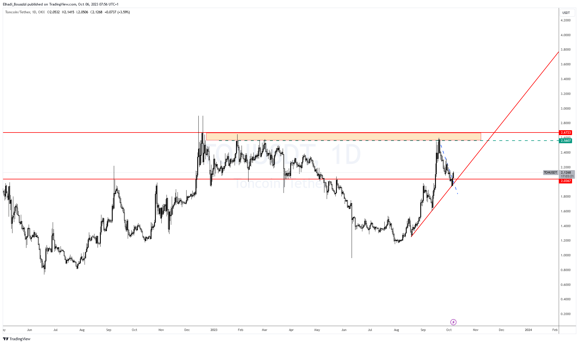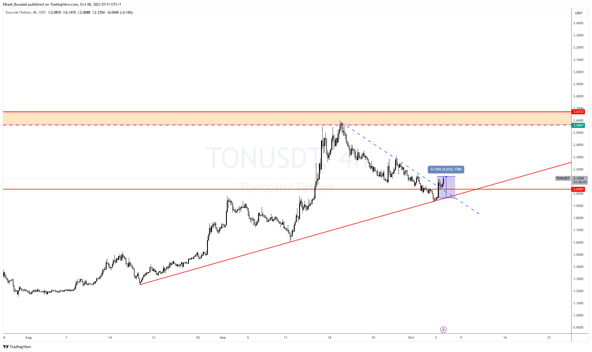 يبدو أن التحليل كان موفق، ولكن سعر تونكوين TON هبط حتى مستوى 1.93 دولار لملامسة خط الاتجاه الصاعد. قبل أن يبدأ في الصعود مرة أخرى.