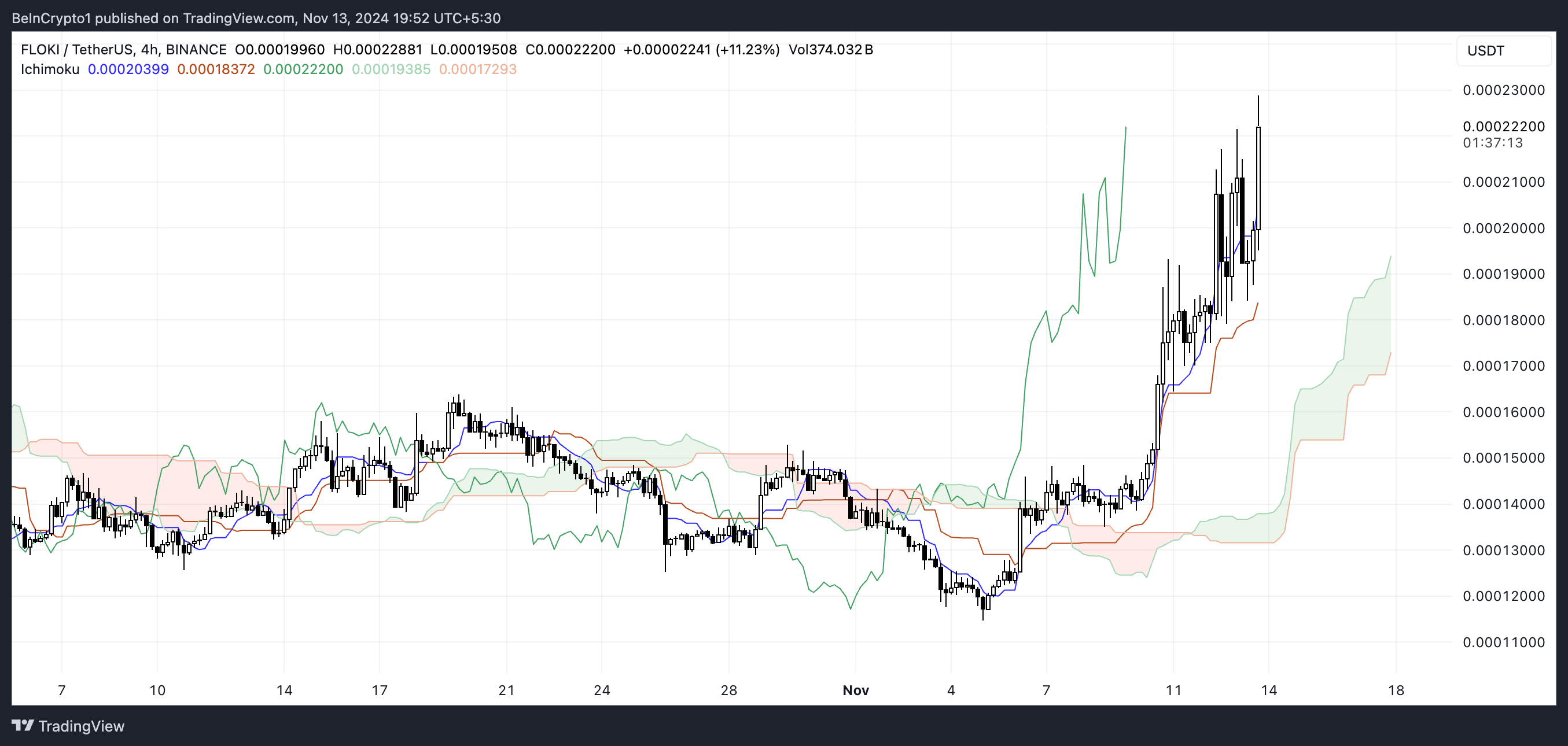 ومع ذلك، يظهر تراجع صغير، مما يشير إلى أن سعر FLOKI قد يواجه بعض التعزيز أو التراجع قبل اتخاذ قرار بشأن خطوته التالية. طالما أن السعر يظل فوق السحابة، من المرجح أن يظل الاتجاه الصعودي سليمًا.