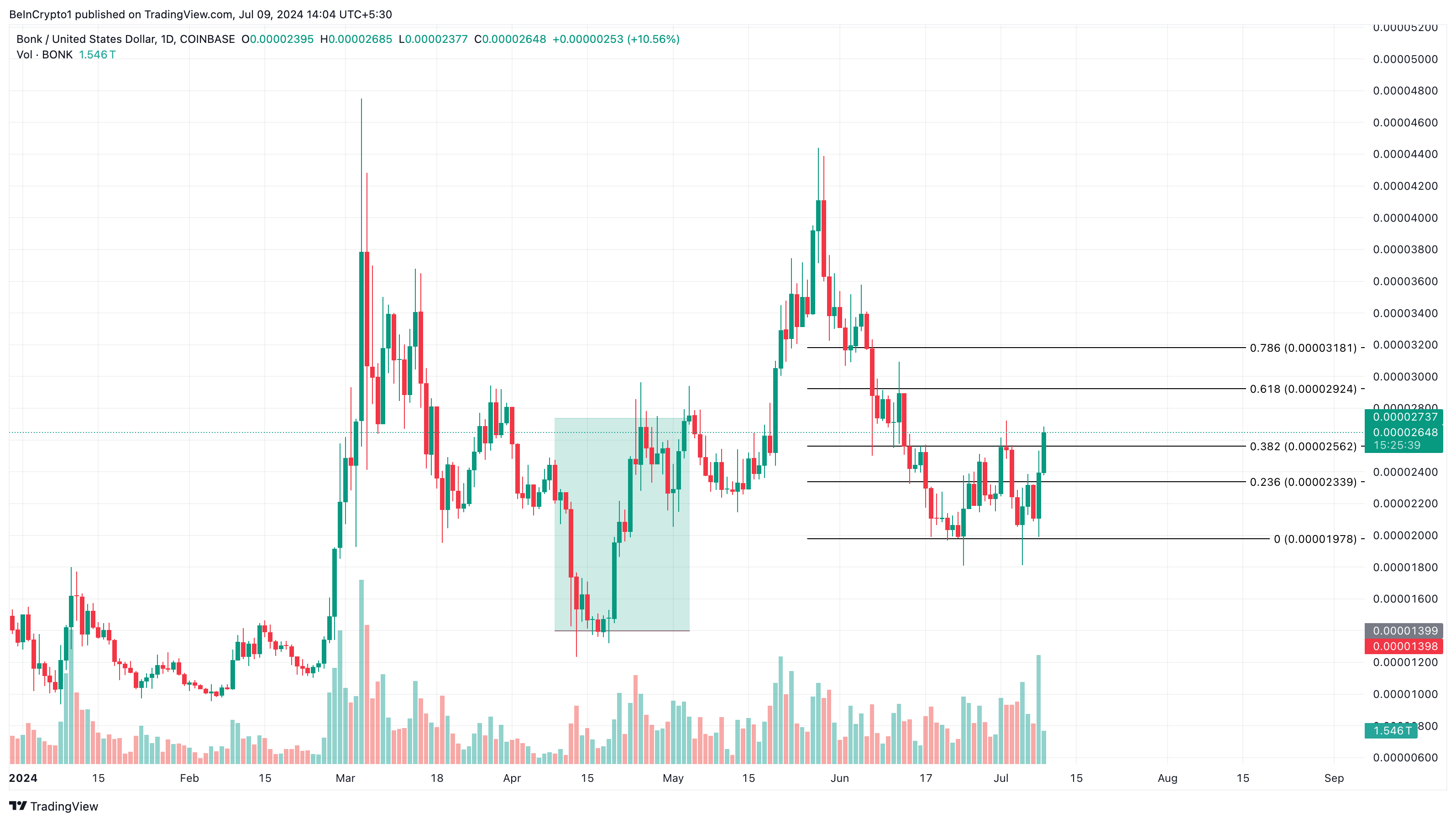 بونك (BONK)، عملة الميم المبنية على بلوكتشين سولانا، أصبحت الأعلى ربحًا في السوق. وقد حدث ذلك بعد أن قفز سعرها بنسبة 25,08% خلال آخر 24 ساعة.