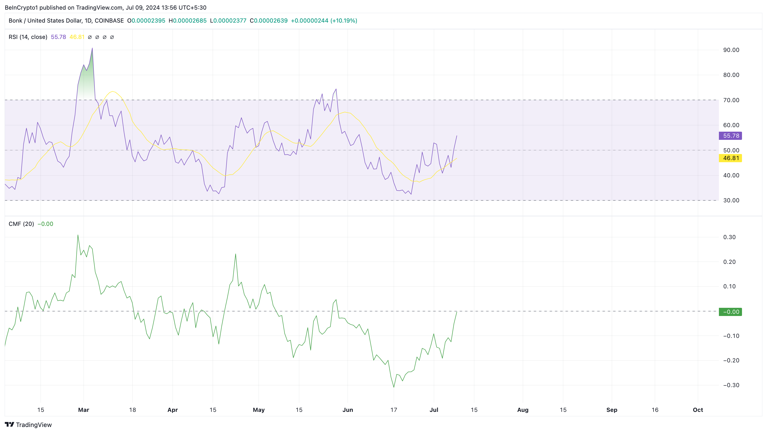 يشير التحليل الفني إلى إمكانية استمرار ارتفاع سعر BONK. فمؤشر القوة النسبية (RSI)، الذي يقيس زخم حركة السعر، يشير إلى وجود قوة شرائية. كما أن مؤشر تدفق الأموال Chaikin Money Flow (CMF)، الذي يقيم تدفق الأموال إلى الأصل المالي، على وشك الدخول في المنطقة الإيجابية.