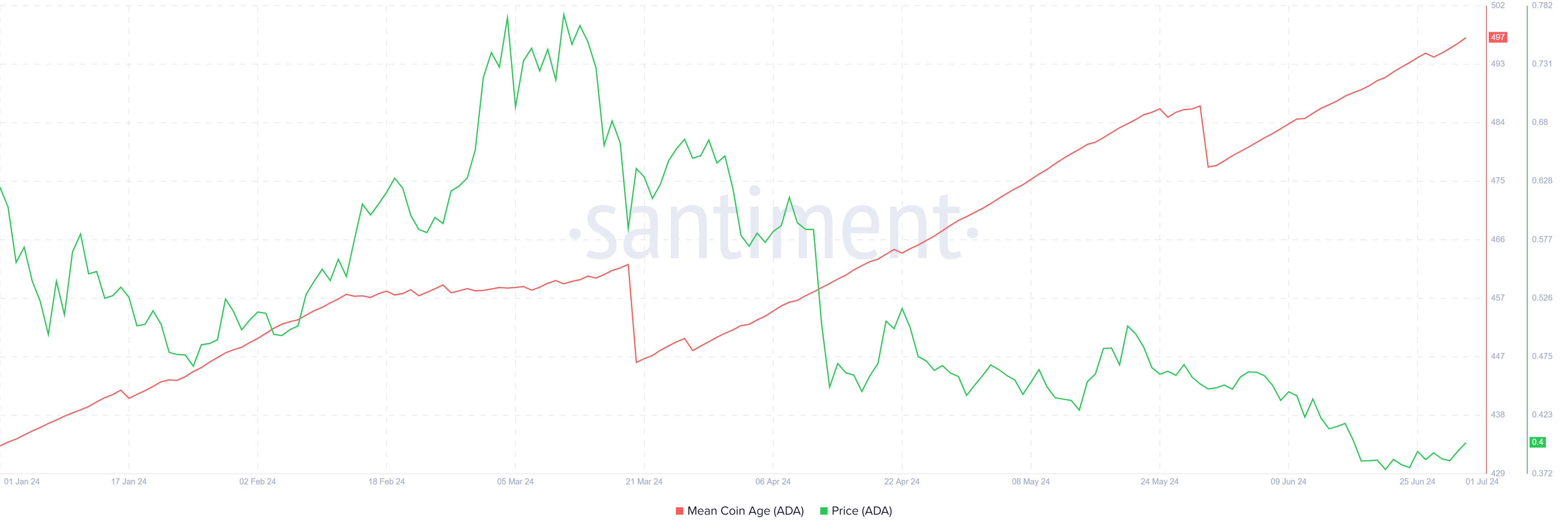 قد يكون سعر كاردانو قد سجل انخفاضات خلال يونيو، لكن ذلك لم يمنع المستثمرين من الاحتفاظ بالعملات. فقد استمر متوسط عمر العملة في الزيادة، مما يشير إلى أن متوسط عمر العملات المحتفظ بها يرتفع.