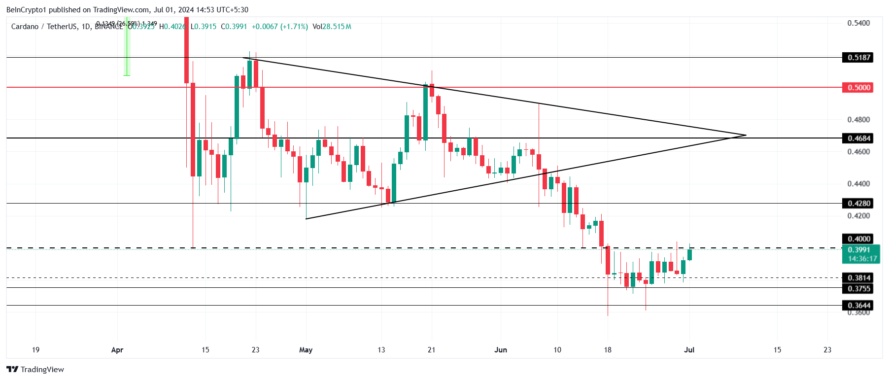 انخفض سعر كاردانو من مثلث متماثل صاعد قبل شهر في بداية يونيو. منذ ذلك الحين، أدى الانخفاض إلى أن يتم تداول العملة البديلة من الجيل الثالث بأقل من 0,40$.
