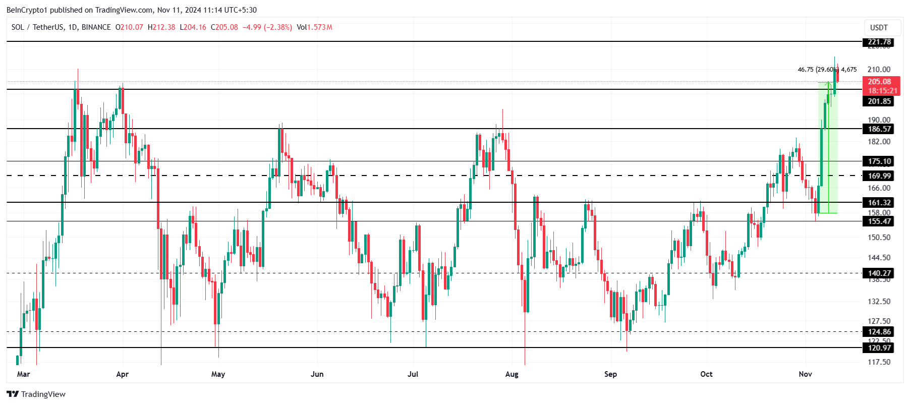 إذا بدأ المستثمرون في جني الأرباح، قد تتجه SOL نحو 186$، وهو أرضية دعم حاسمة للعملة البديلة. الحفاظ على مستوى أعلى من 186$ أمر ضروري للحفاظ على الاتجاه الصعودي الأخير، حيث أن الكسر أدنى من هذا المستوى قد يشير إلى تصحيحات أعمق.