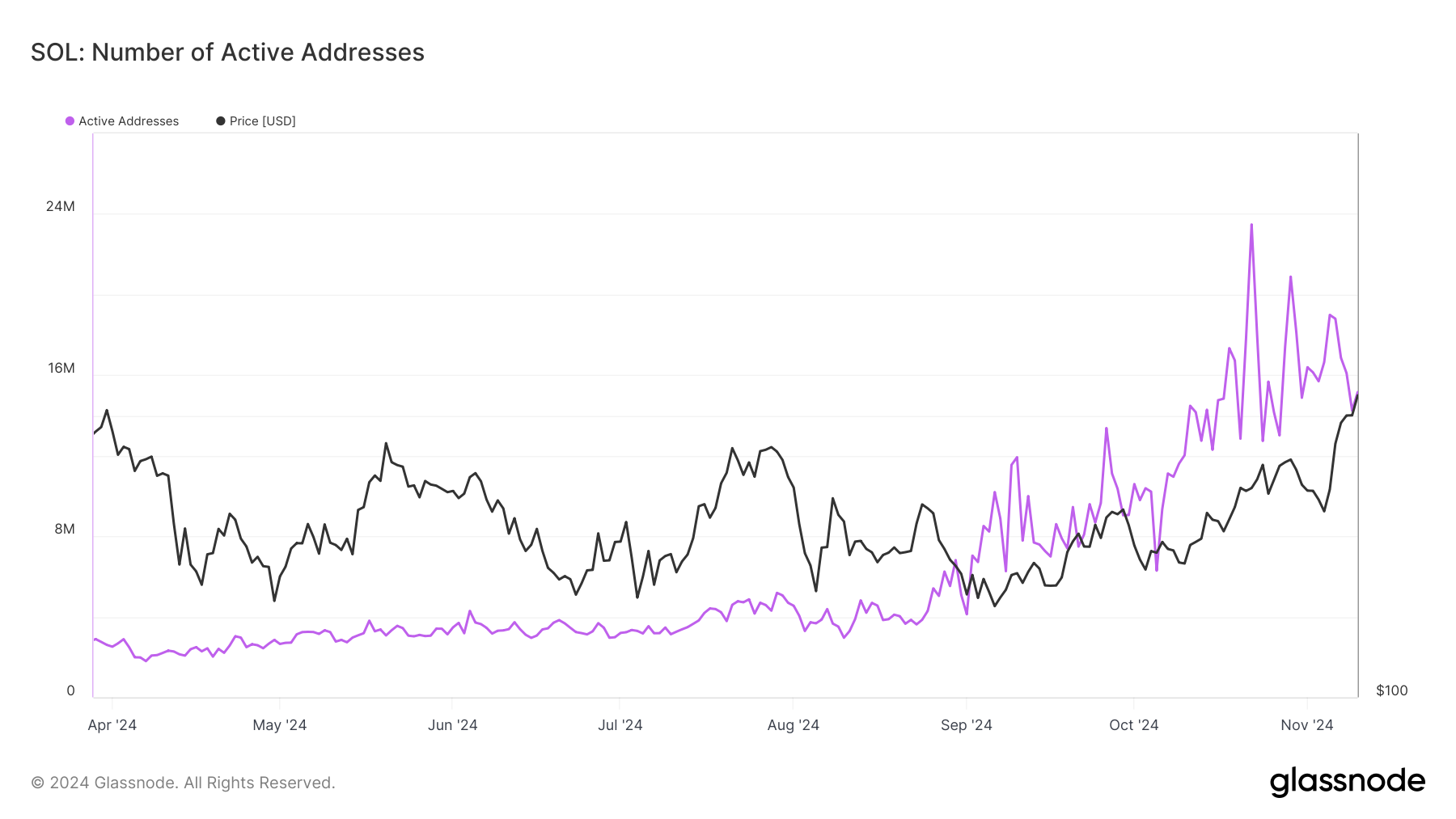 على الرغم من ارتفاع سعر سولانا، فإن العناوين النشطة على الشبكة تظهر انخفاضًا. أدى هذا الانخفاض إلى تباين سعر DAA (العناوين النشطة يوميًا)، مما يشير إلى ضغط بيع محتمل. عندما يرتفع السعر بجانب انخفاض العناوين النشطة، فإنه غالبًا ما يشير إلى أن عددًا أقل من المستثمرين يتفاعلون مع الأصل، مما قد يؤدي إلى انخفاض في الزخم.