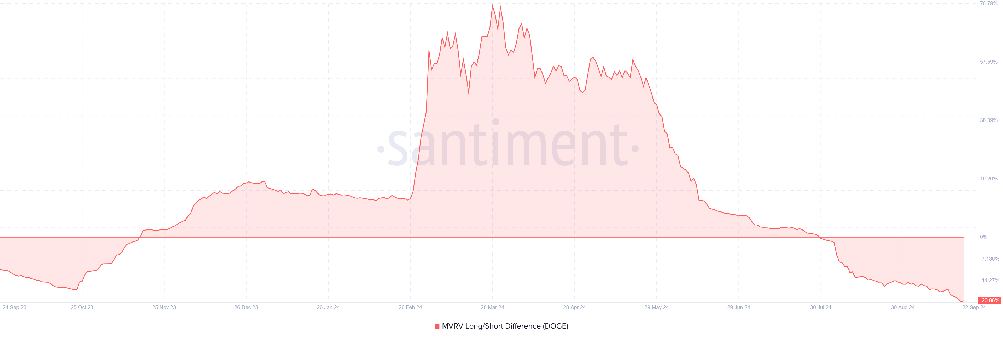 عامل آخر يؤثر على إمكانية تجمع دوجكوين هو فرق MVRV طويل/قصير الأجل، والذي يبلغ حاليًا -20%. يقيم هذا المؤشر الربحية من خلال مقارنة حاملي الأجل القصير والطويل.