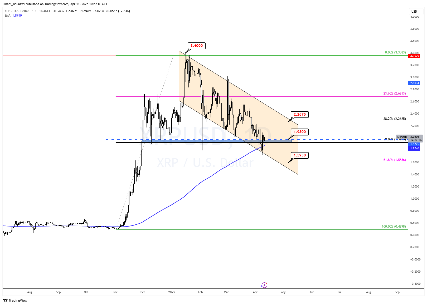 السعر حاليًا يتداول بالقرب من مستوى 2.0206 دولار، بعدما ارتد سابقًا من منطقة الدعم القوي عند 1.9725 – 1.9470، والتي تتزامن مع مستوى 50% من تصحيح فيبوناتشي للموجة الصاعدة السابقة، ما يعزز أهميتها كمستوى مفصلي.