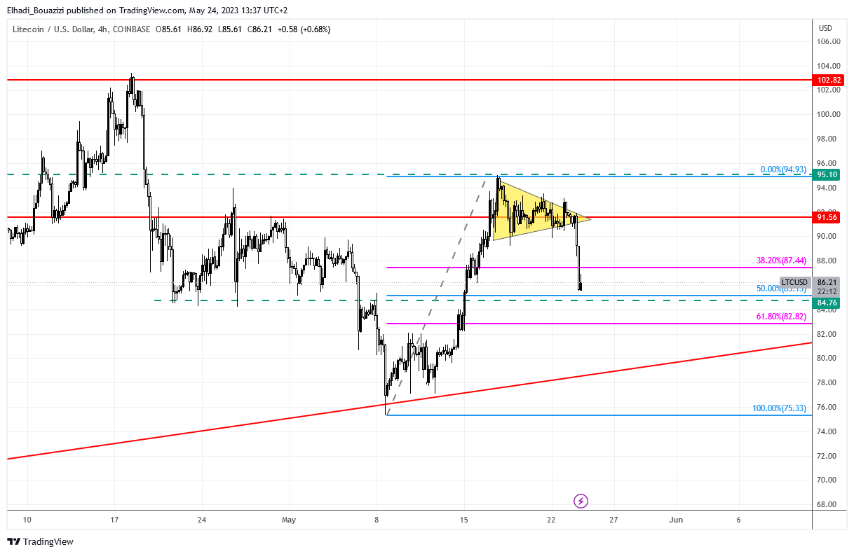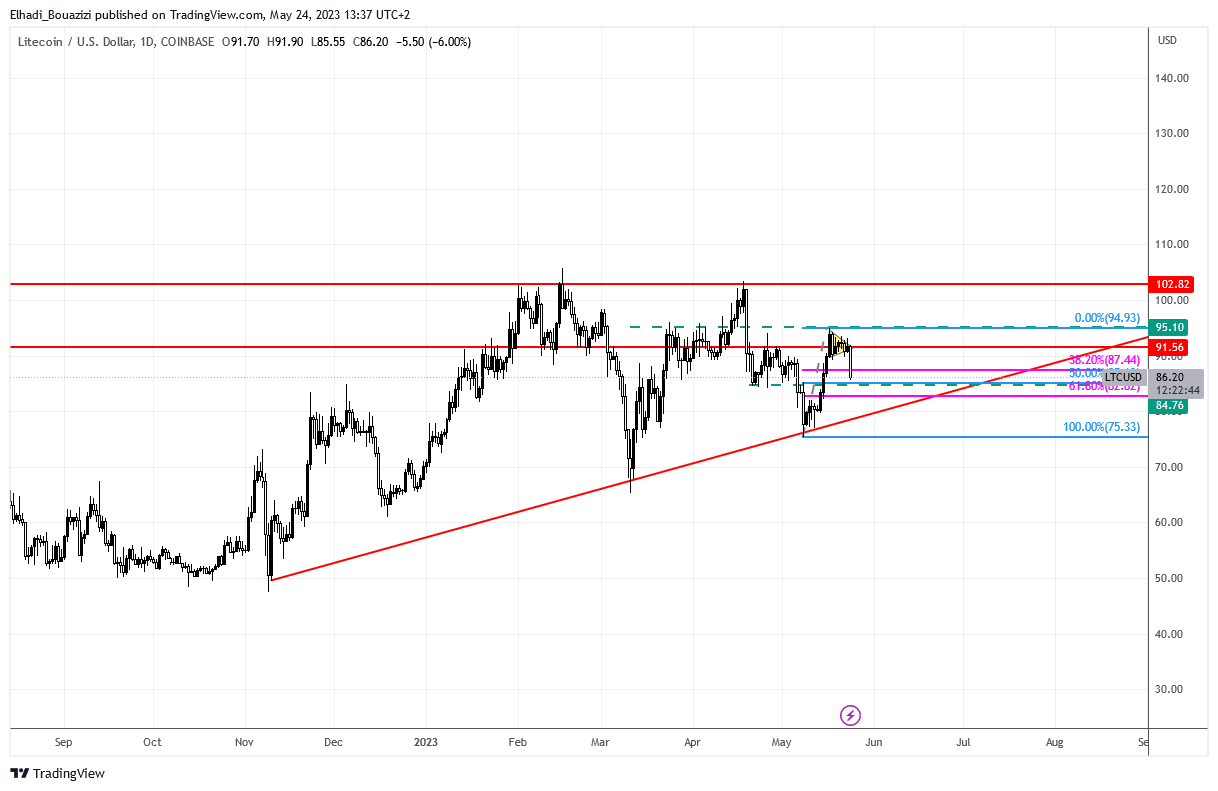 انخفض سعر عملة LTC في تداولات اليوم بنسبة بلغت 5.78% في وقت كتابة هدا التقرير. وخلال الأسبوعين الماضيين كان سعر لايتكوين LTC قد سجّل ارتفاعات قوية بلغت 25%. وبلغ ذروته عند مستوى 95.10 دولار في 17 مايو الماضي .