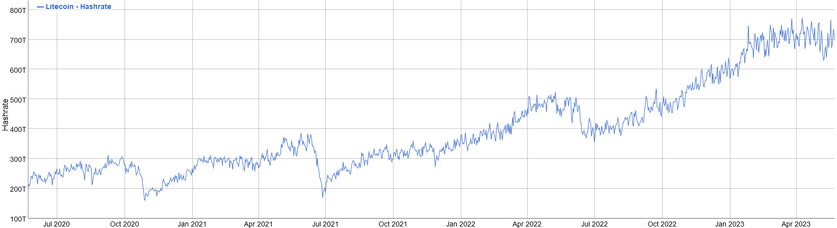 معدل الهاش هو مقياس لقوة المعالجة في سلسلة كتل لايتكوين. وقد ارتفع بنسبة 45% خلال العام الماضي ليصل إلى 730 تيراهاش/ثانية. حسب بيانات من BitInfoCharts . وتشير هذه الزيادة إلى مستوى متزايد من الاهتمام من قِبَل المُعدّنين. الذين يلعبون دورًا حيويًا في ضمان أمان الشبكة وتوثيق المعاملات.