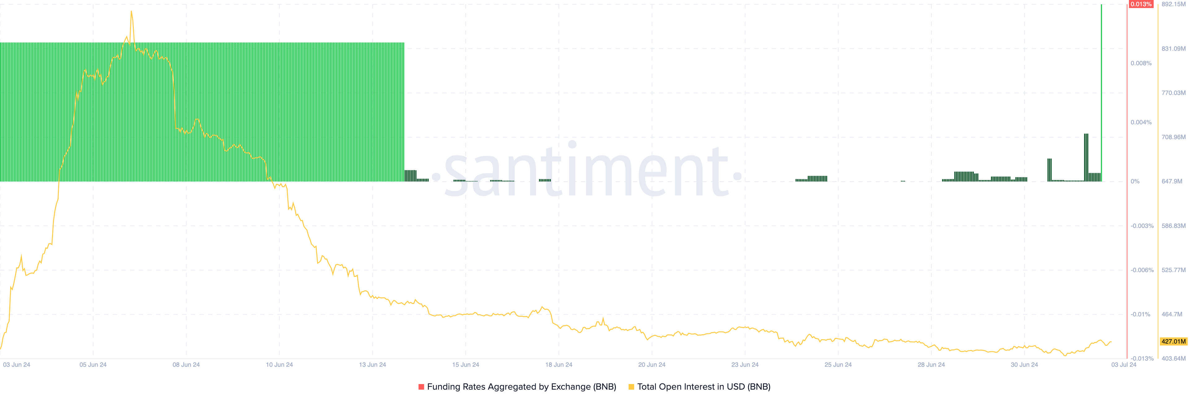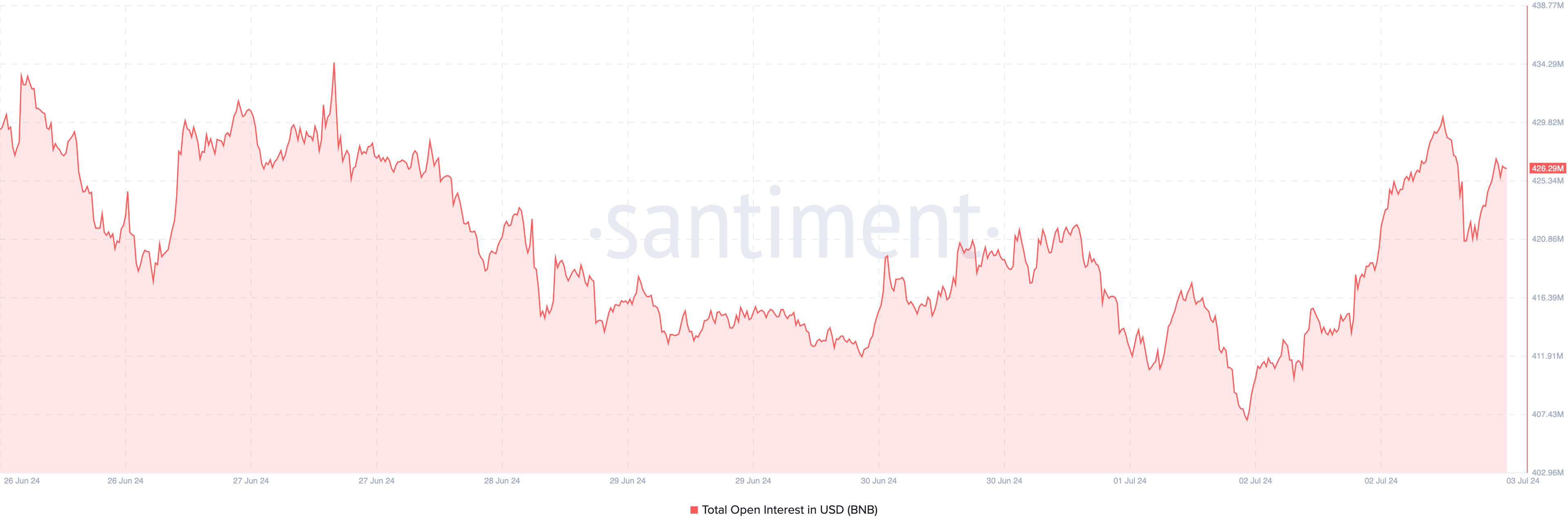 وفقًا لـ Santiment، انخفض الفائدة المفتوحة لـ BNB في البداية إلى 420,31 مليون دولار. ولكن في وقت كتابة هذا التقرير، بلغت القيمة 429,29 مليون دولار، مما يشير إلى قفزة في النشاط التكهني.