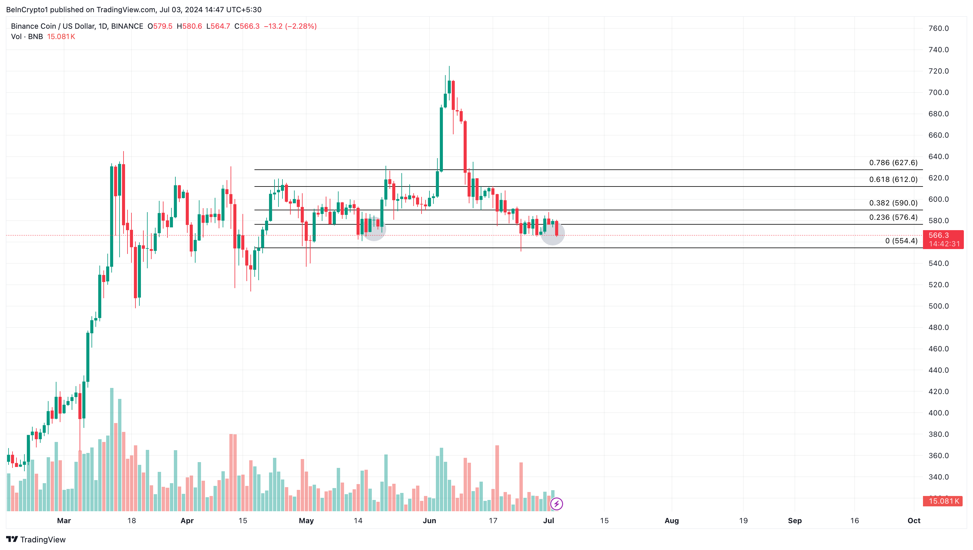 تقوم BeInCrypto أيضًا بفحص مؤشر فيبوناتشي للارتداد، الذي يحدد نقاط الدعم والمقاومة. في وقت كتابة هذا التقرير، يبدو أن BNB قد وصلت إلى قاع عند 566,40 دولارًا. وبالتالي، قد يؤدي زيادة الضغط الشرائي إلى إرسال العملة إلى 576,40 دولارًا.