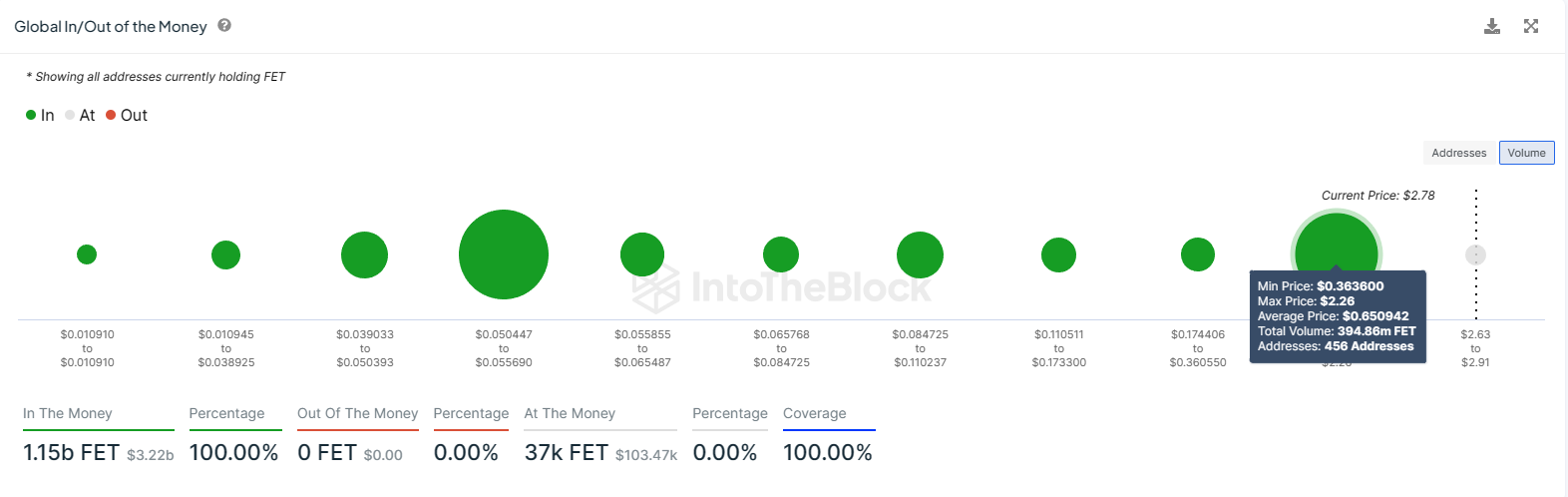 بعيدًا عن الحيتان، تتمتع العملة البديلة أيضًا بدعم قوي عند نقطة السعر 2.26 دولار. هذا المستوى هو الحد الأعلى للنطاق الذي تم فيه شراء حوالي 394 مليون توكن FET بقيمة تزيد عن 1.1 مليار دولار من قبل المستثمرين.