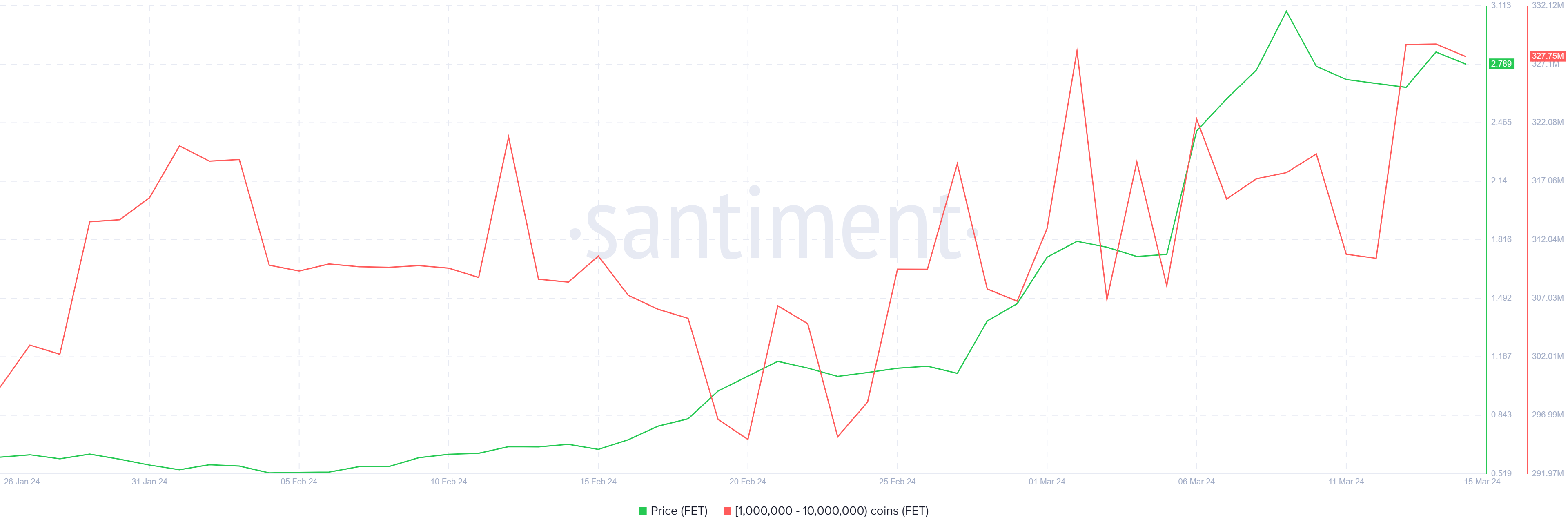 يُلقي تصحيح سوق العملات الرقمية بثقله على جميع الأصول الرقمية، ولكن سعر عملة FET لم ينخفض بنفس القدر بطريقة ما. لاحظ FET تصحيحًا بنسبة 2% فقط على مدار اليوم. ومع ذلك، فإن ذلك لا يغطي على حقيقة أن العملة البديلة كان من الممكن أن تنخفض بنسبة تزيد عن 15%. كل الشكر للحيتان لعدم السماح بحدوث ذلك.
