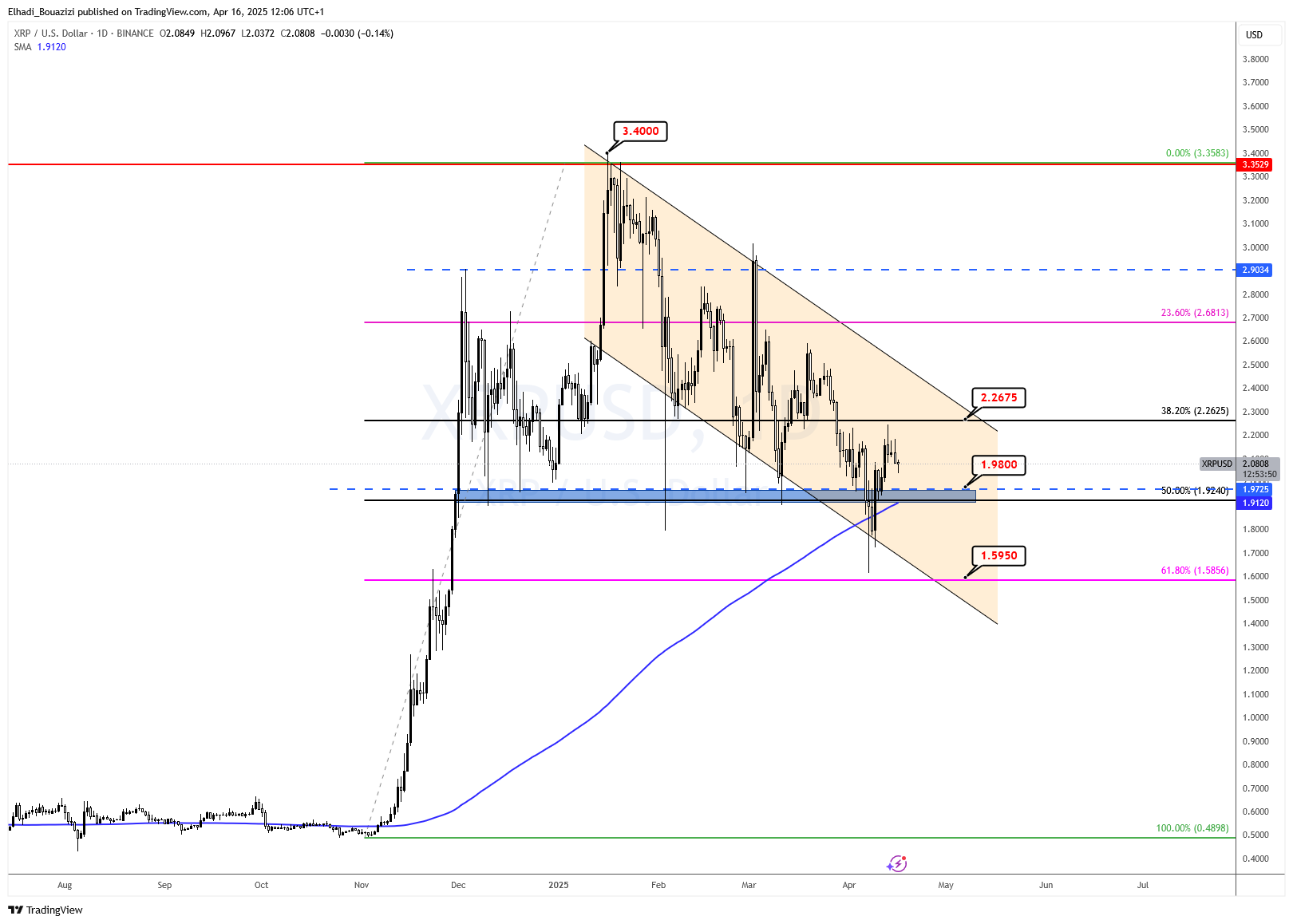 حاليًا، يتداول السعر حول مستوى 2.08 دولار، بعد ارتداده مؤخرًا من منطقة دعم قوية تمتد بين 1.91 و1.98 دولار، والتي تتقاطع مع المتوسط المتحرك البسيط 200 يوم ومستوى 50% من تصحيح فيبوناتشي.