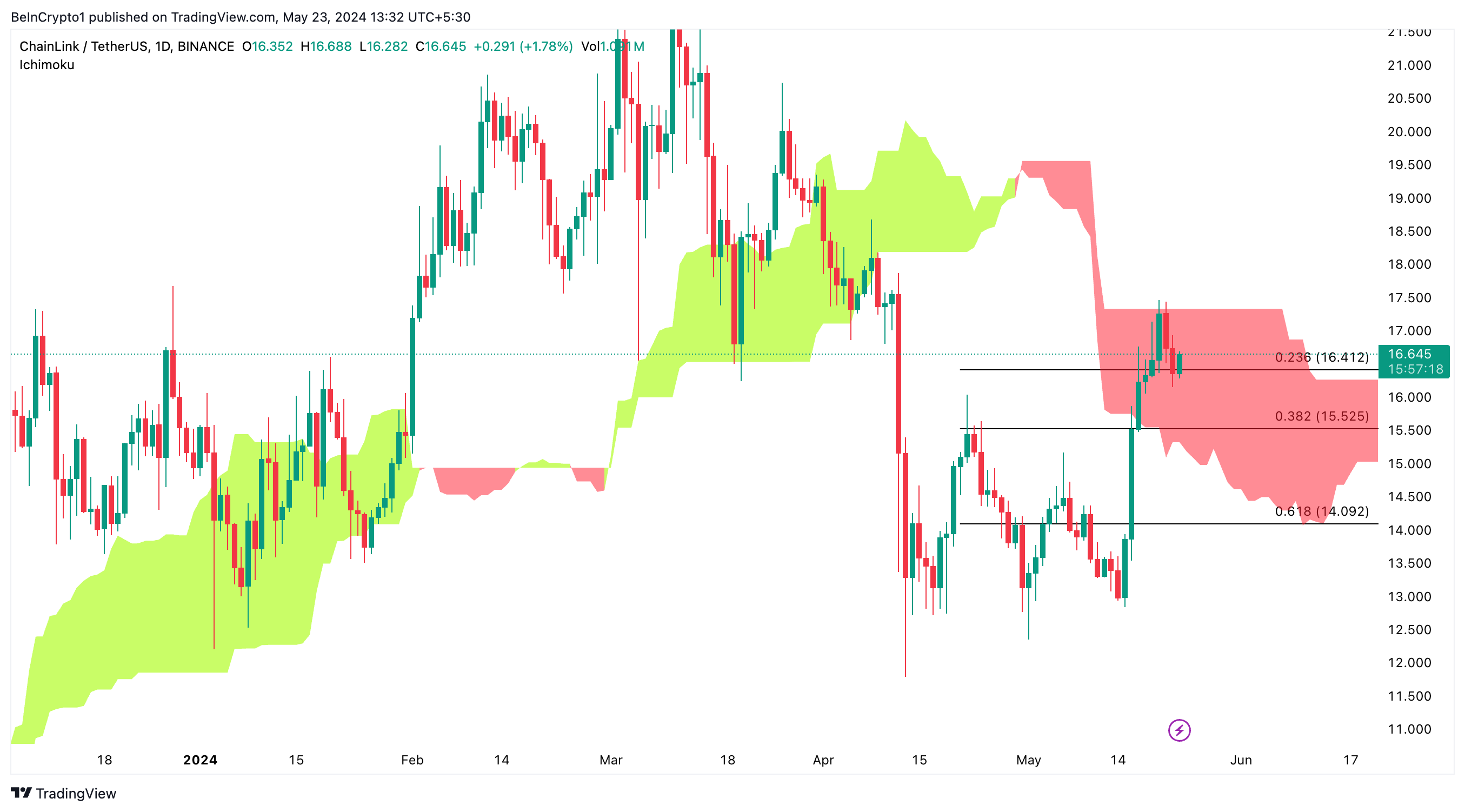 على الإطار الزمني اليومي، اختبرت عملة LINK Chainlink الحد العلوي لسحابة إيشيموكو ، والتي تبلغ حاليا حول علامة 17.41 دولارا. يشير هذا الاختبار إلى مستوى مقاومة قوي. قد يشير الاختراق الناجح فوق هذا الحد إلى مزيد من الزخم الصعودي.