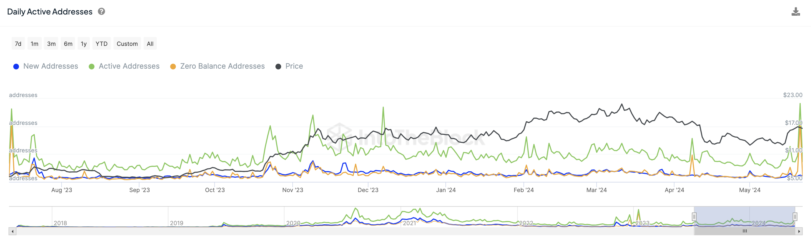 ساعد الارتفاع الأخير في النشاط على السلسلة ل Chainlink في دفع سعره من 13 دولارا إلى 17 دولارا. هذه الزيادة في النشاط واضحة في الزيادة الحادة في العناوين النشطة اليومية ، كما هو موضح في الرسم البياني.