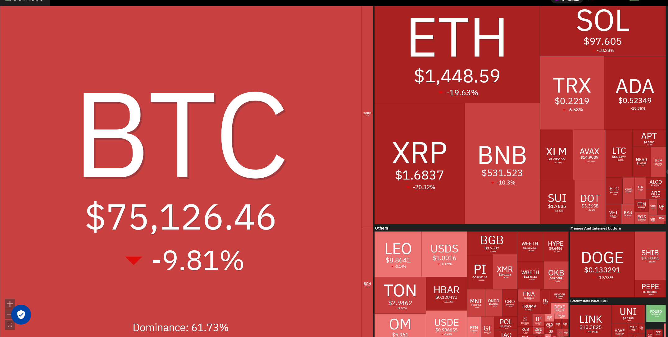 Sponsoredتراجعت عملة بيتكوين (BTC) بأكثر من 9.8% لتسجل 75,126 دولار، وهو أدنى مستوى لها في ثلاثة أسابيع. وسجلت إيثريوم (ETH) انخفاضًا حادًا بنسبة 19.63% إلى 1,448 دولار، في حين انخفضت ريبل (XRP) بنسبة 20.32% إلى 1.683 دولار.
