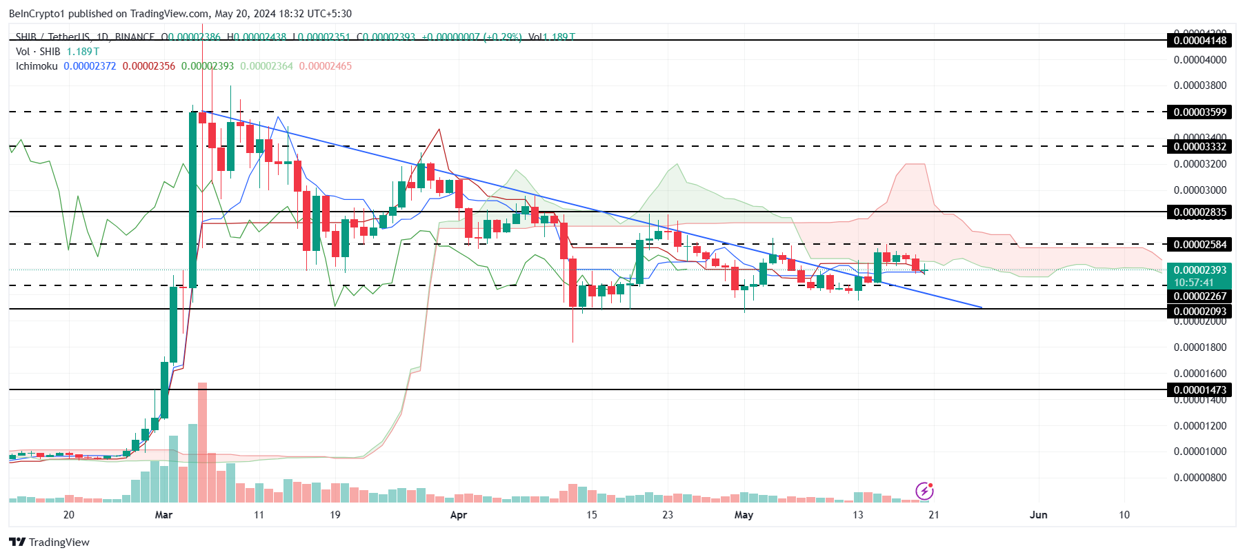 يتغير سعر شيبا إينو عند 0.00002393 دولار بعد الهروب من الاتجاه الهبوطي الذي كان تحته لمدة شهرين ونصف. تم دمج عملة الميم حاليا في حدود 0.00002584 دولار و 0.00002267 دولار.