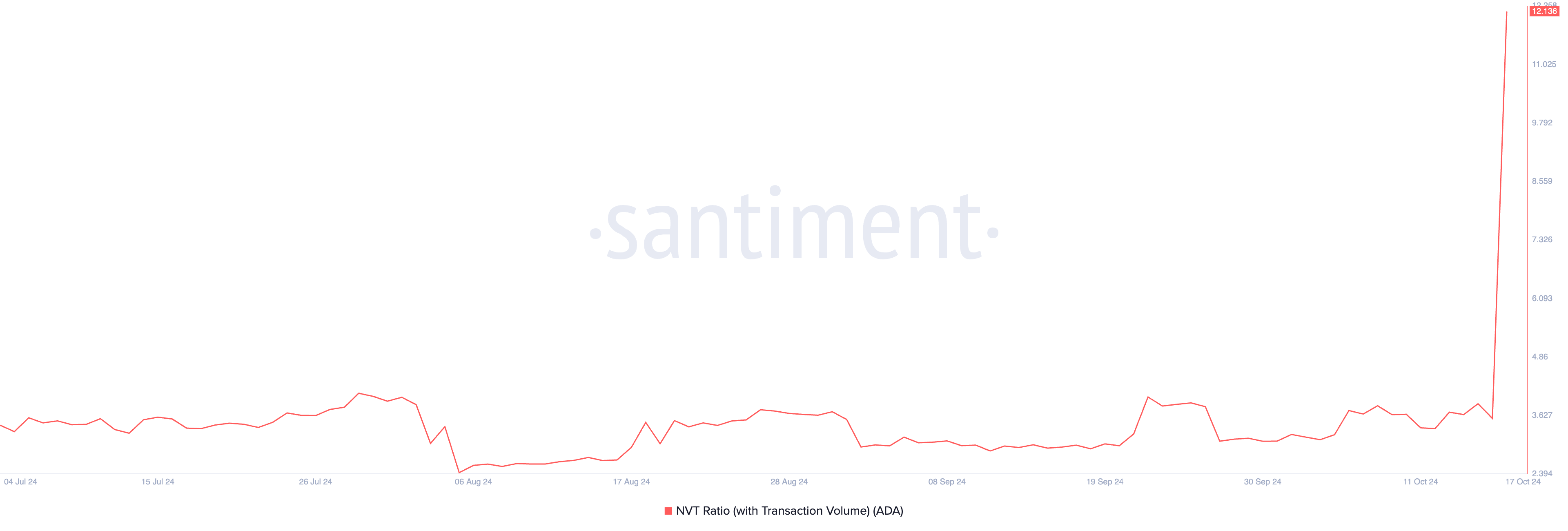 في وقت كتابة هذا التقرير، نسبة قيمة شبكة كاردانو إلى المعاملات (NVT)، التي تقيم قيمتها، تقع عند أعلى مستوى لها منذ فبراير 2023. وفقاً لبيانات Santiment، هذه النسبة هي 12,13.