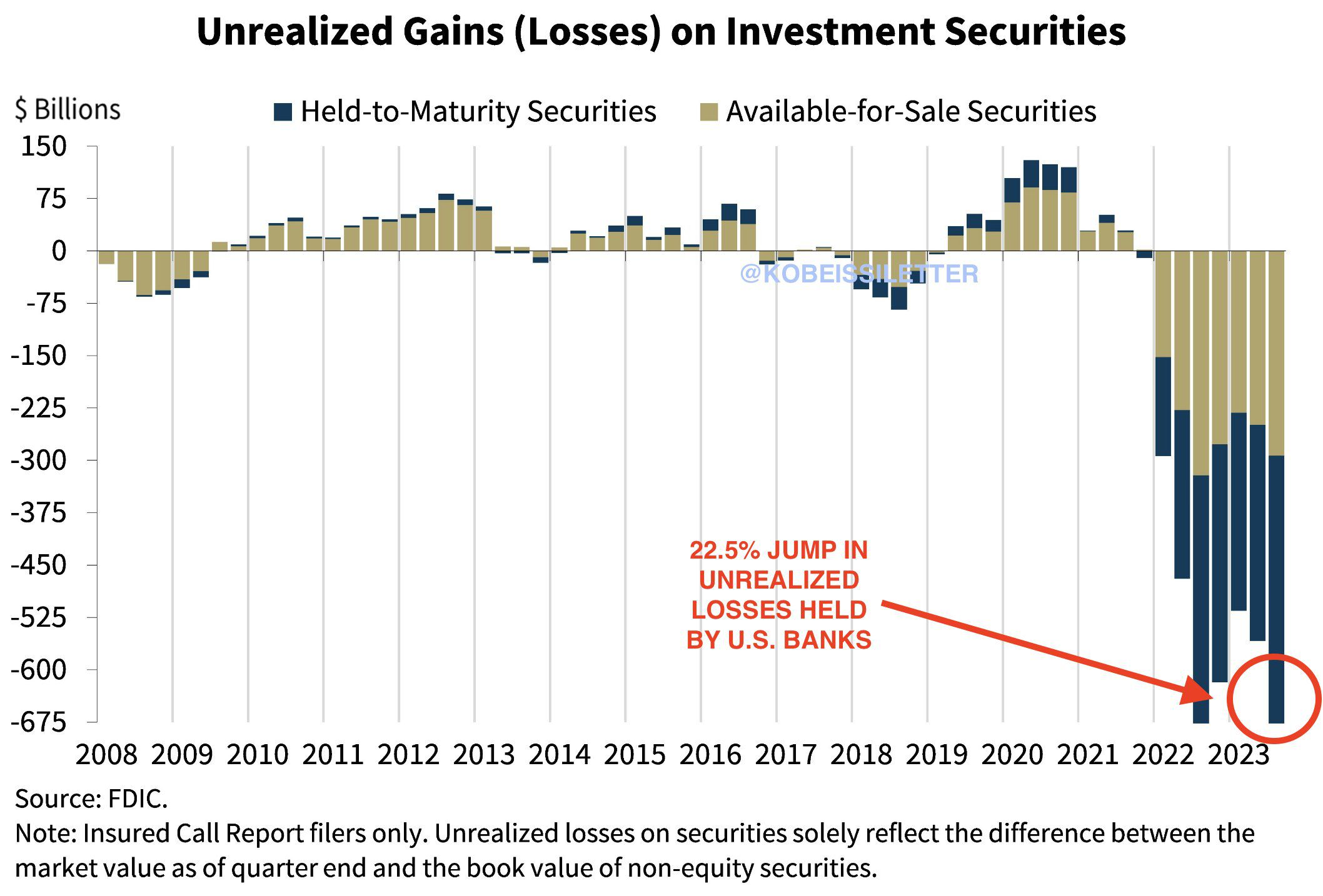 البنوك الأمريكية لم تخرج من الأزمة بعد وما زالت تعاني من الأزمة المصرفية التي هزت البلاد في وقت سابق من هذا العام. تستمر الخسائر غير المحققة في التزايد، وهي ليست مشكلة كبيرة حتى تصبح كذلك.