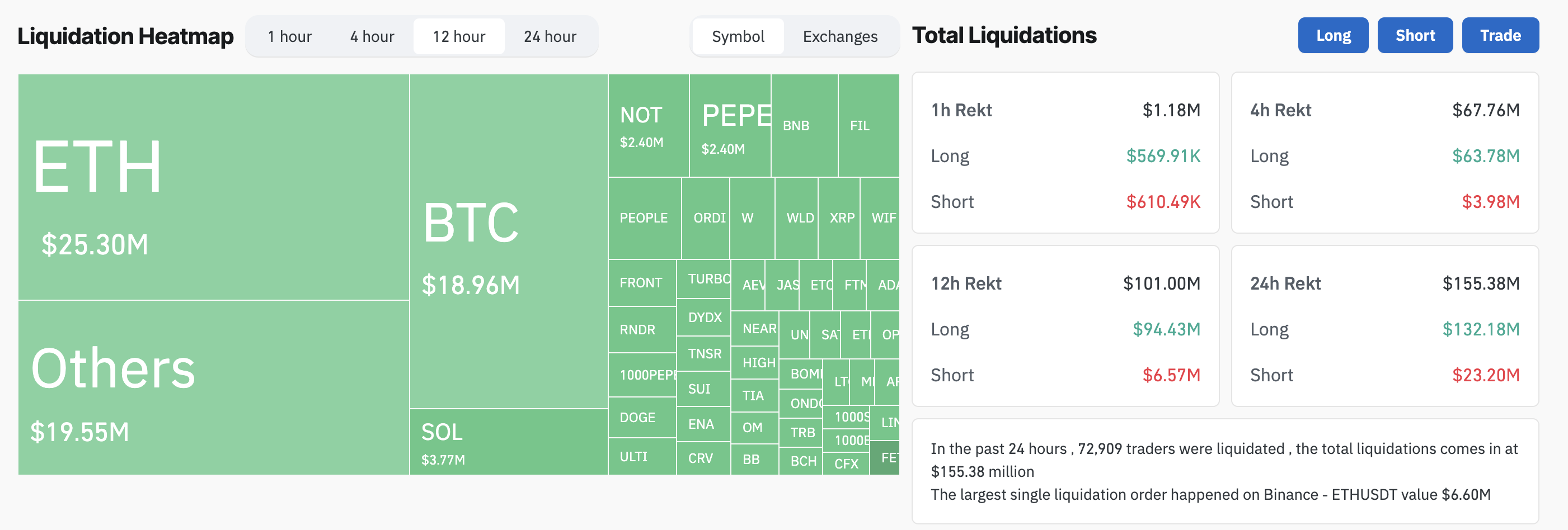 وقد أثرت هذه التحولات بشكل كبير على أرصدة الصناديق واستقرار السوق، مما أدى إلى تصفية 101 مليون دولار من العملات المشفرة خلال ال 12 ساعة الماضية. من هذا ، كان 94.43 مليون دولار من المراكز الطويلة ، في حين شهدت الصفقات القصيرة عمليات تصفية بلغت 6.57 مليون دولار.