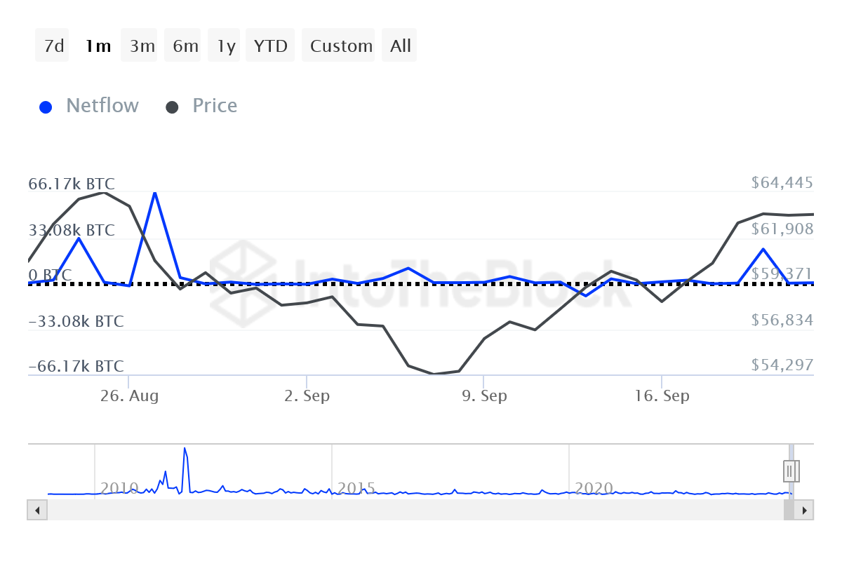 الرسم البياني IntoTheBlock أدناه يتتبع صافي تدفقات البيتكوين من وإلى محافظ التي تملك على الأقل 0.1% من إجمالي المعروض المتداول من عملات BTC.