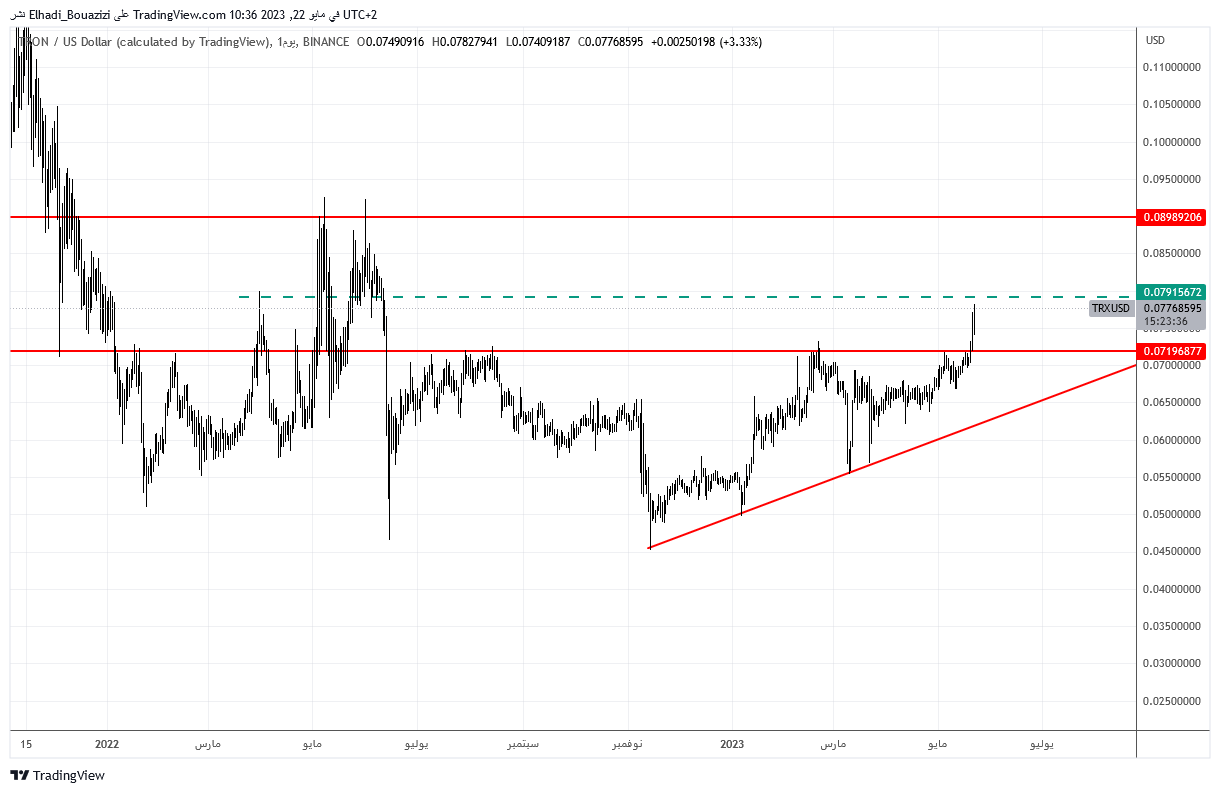 كما نلاحظ على الرسم البياني اليومي أن سعر ترون TRX قد اخترق مستوى المقاومة القوي 0.0720 دولار والسعر الآن يقترب من اختبار مستوى المقاومة التالي عند 0.791 دولار.