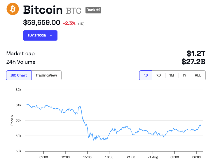 في وقت كتابة هذا، يتم تداول البيتكوين بسعر 59,659 دولار، مع تراجع متواضع بنسبة 2,3% خلال الـ24 ساعة الماضية.
