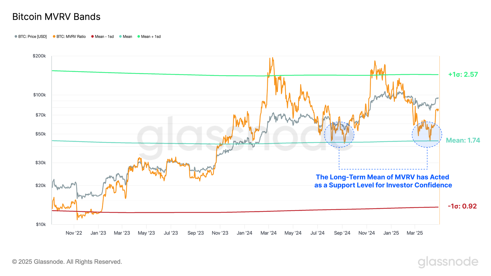 أبرز هذه المؤشرات كان نسبة MVRV، التي تقارن بين القيمة السوقية والقيمة المحققة، وقد عادت إلى متوسطها طويل الأجل البالغ 1.74، وهو مستوى مماثل لما سُجّل خلال موجة التصحيح في أغسطس 2024.