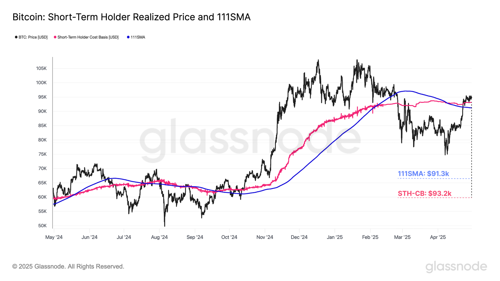 وتتوافق هذه الحركة مع دعمين فنيين مهمين، هما المتوسط الحسابي  111 يوم (111DMA) البالغ 91,300 دولار، ومتوسط تكلفة حيازة المستثمرين قصيري الأجل (STH) عند 93,200 دولار.
