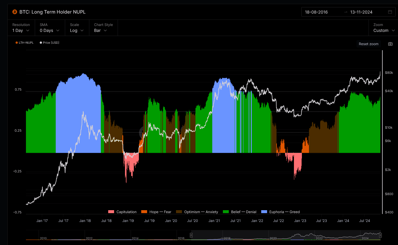وفقًا لمؤشر صافي الأرباح/الخسائر غير المحققة للحاملين على المدى الطويل (NUPL). الذي يتتبع ربحية العملات المحتفظ بها من قبل المستثمرين طويل الأمد. فإن المؤشر يقع حاليًا في منطقة "الجشع" ولكنه لم يصل بعد إلى مستويات "الجشع الشديد" التي شهدتها الدورات السابقة.