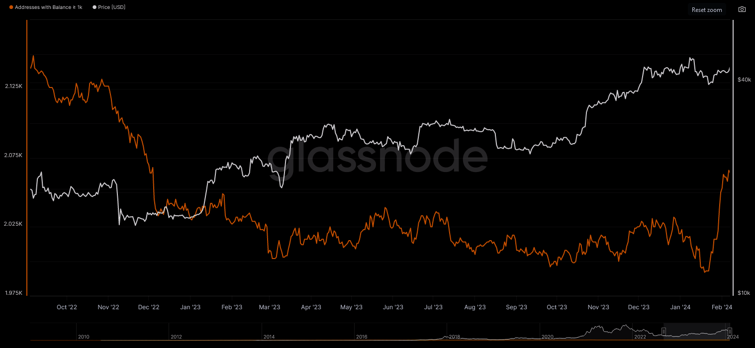 حيث ارتفع عدد محافظ بيتكوين التي تحتفظ بأكثر من 1,000 BTC أو ما يعادل حوالي 44 مليون دولار بأكثر من 73 محفظة. لتبلغ أعلى مستوى لها منذ ديسمبر من عام 2022، حسب بيانات من Glassnode.