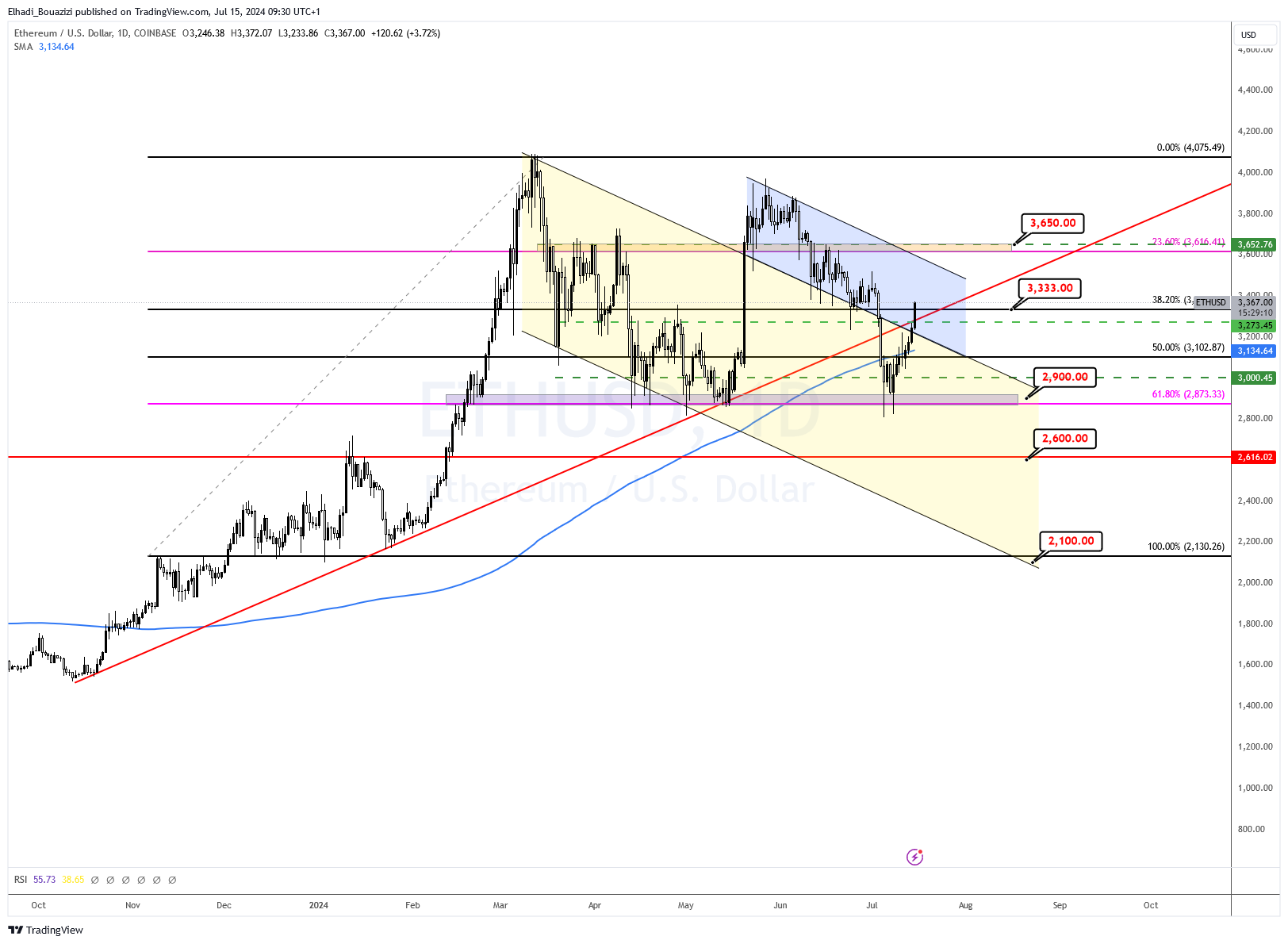 الرسم البياني اليومي لسعر إيثيريوم ETH يشه كثيرا رسم بيتكوين، فهو أيضا يتحرك في قناة سعرية هابطة اخترقها لبض الوقت.