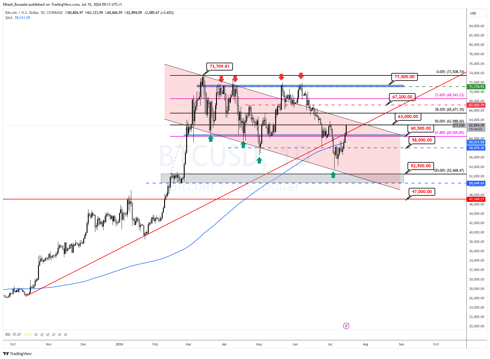 هذا المستوى صار الآن محوريا، حيث بعد استمرار السعر في الصعود نحو مستوى 71,000 دولار. أو العودة للهبوط نحو 56,000 دولار. مع اعتبار الصعود الحالي مجرد حركة تصحيح للموجة الهابطة.