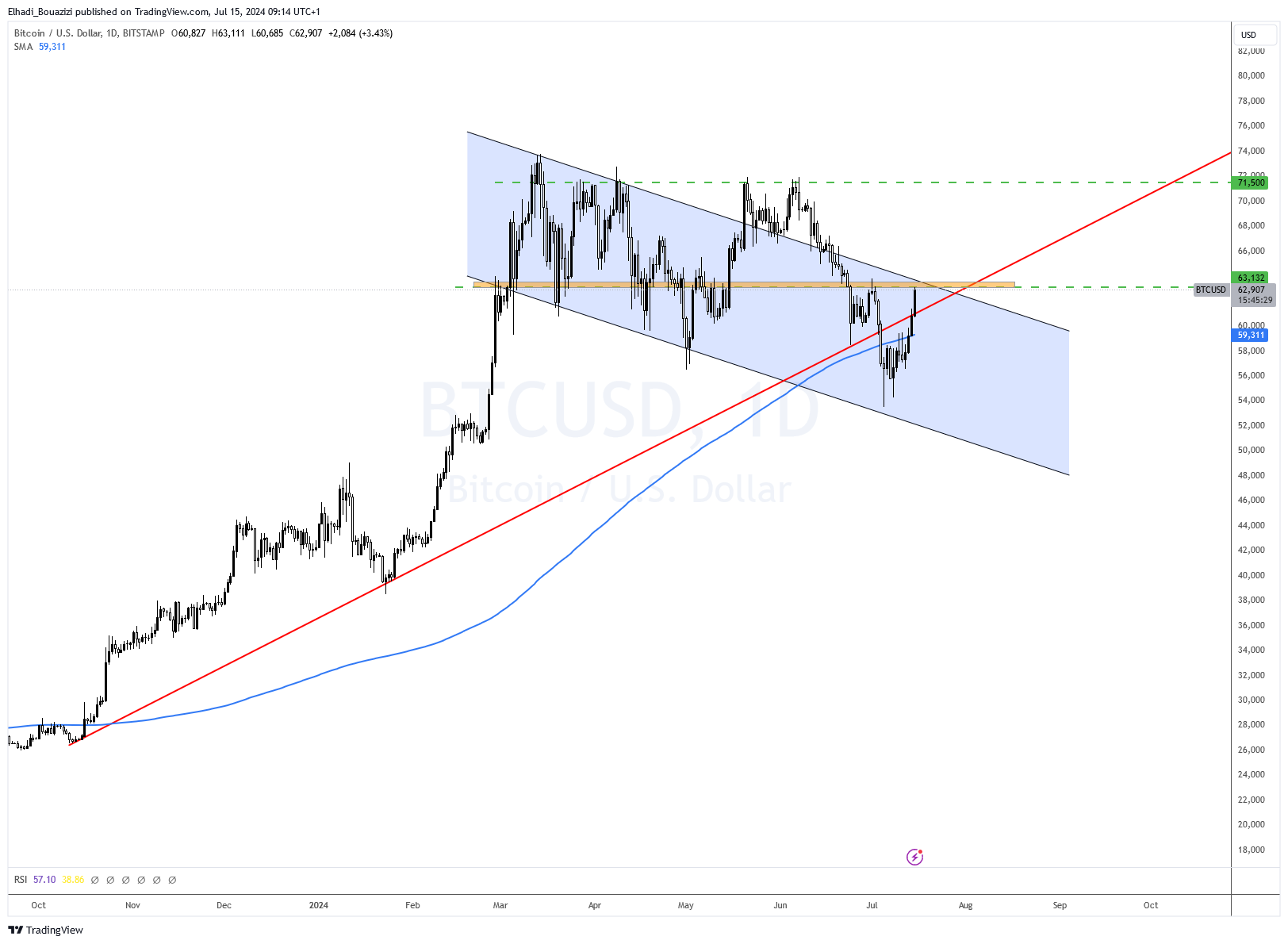 و السعر الآن يختبر مستوى المقاومة 63,000 دولار الذي يتكون من قمة سابقة وتصحيح فيبوناتشي 50% وأيضا كما ذكرنا آنفا الحد العلوي للقناة السعرية الهابطة.
