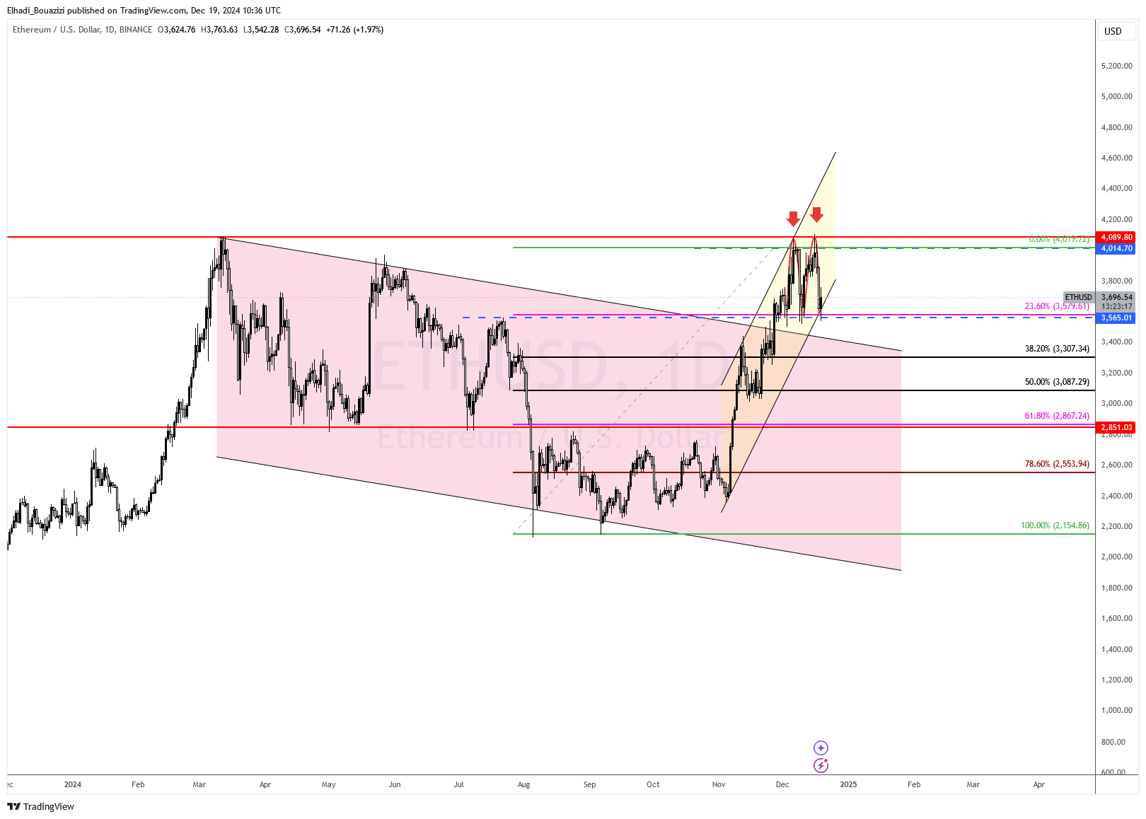 تراجعت أسعار العملات الرقمية بعد أن ألمح البنك الاحتياطي الفيدرالي إلى إمكانية تقليل سرعة خفض الفائدة و التحول إلى التيسير النقدي في العام المقبل. ليزيد بذلك الضغط على أسعار العملات الرقمية البديلة و منها عملة إيثيريوم ETH التي تشهد بالفعل حركة تصحيح سعرية لموجة ترامب الصاعدة.