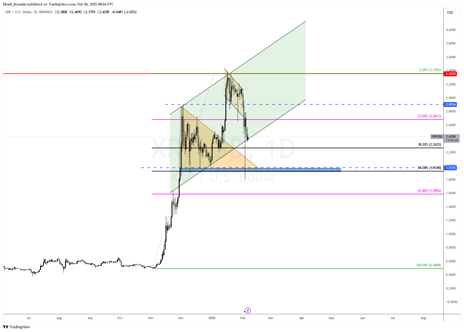 من الناحية الفنية، و رغم قوة التحركات و التقلبات التي شهدتها العملة فإنها بقيت تتداول دائما داخل تشكيلات بيانية منظمة، و هذا يتجلى بوضوح في الرسم البياني اليومي لسعر عملة ريبل XRP.