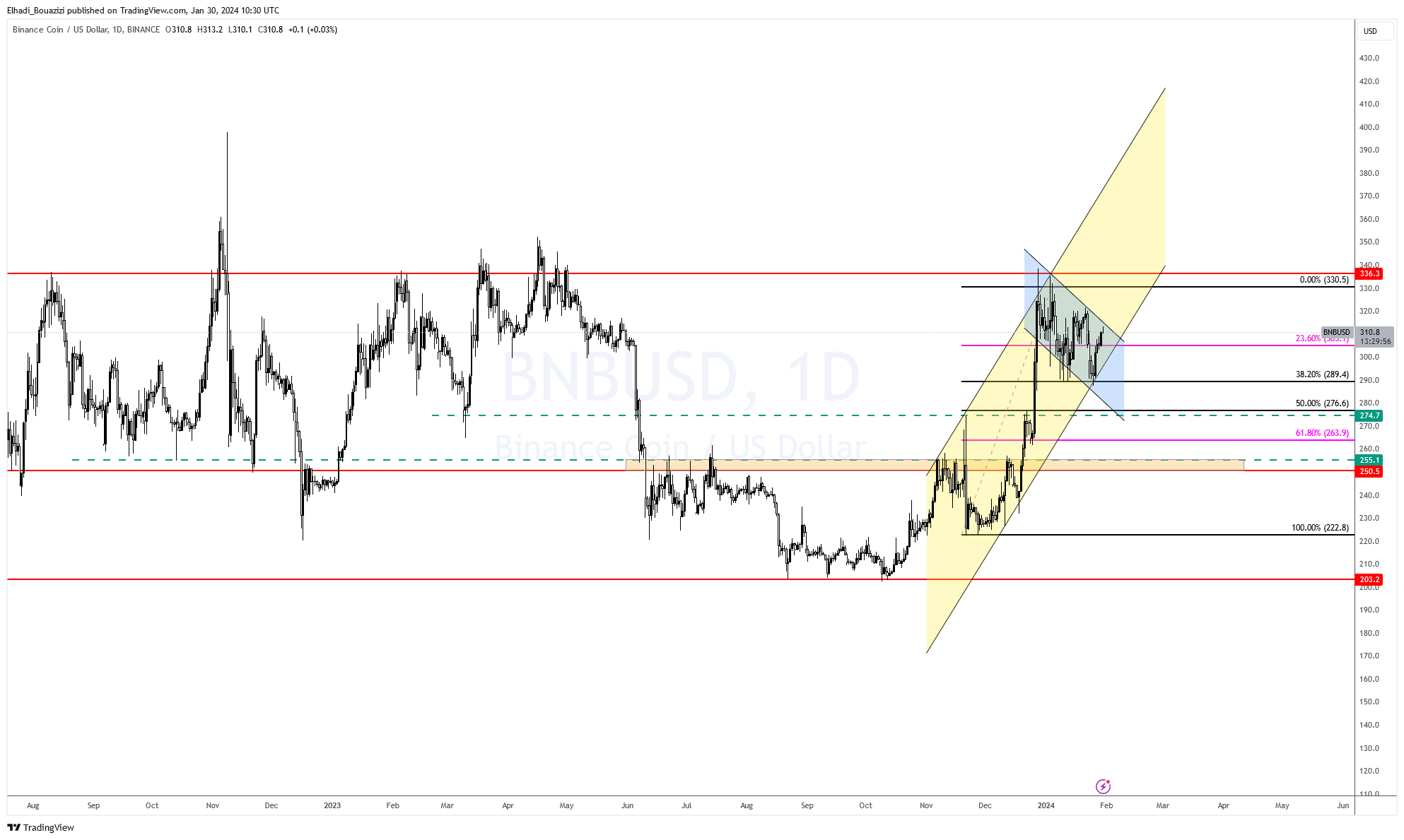 لكن ذلك تغيّر بعد أن تمكن سعر عملة بينانس BNB من اختراق هذه المقاومة. والارتفاع إلى مستوى 336 دولار. معوض بذلك كل الخسائر التي تكبدها العام الماضي بسبب المشاكل القضائية التي عانت منها شركة بينانس.
