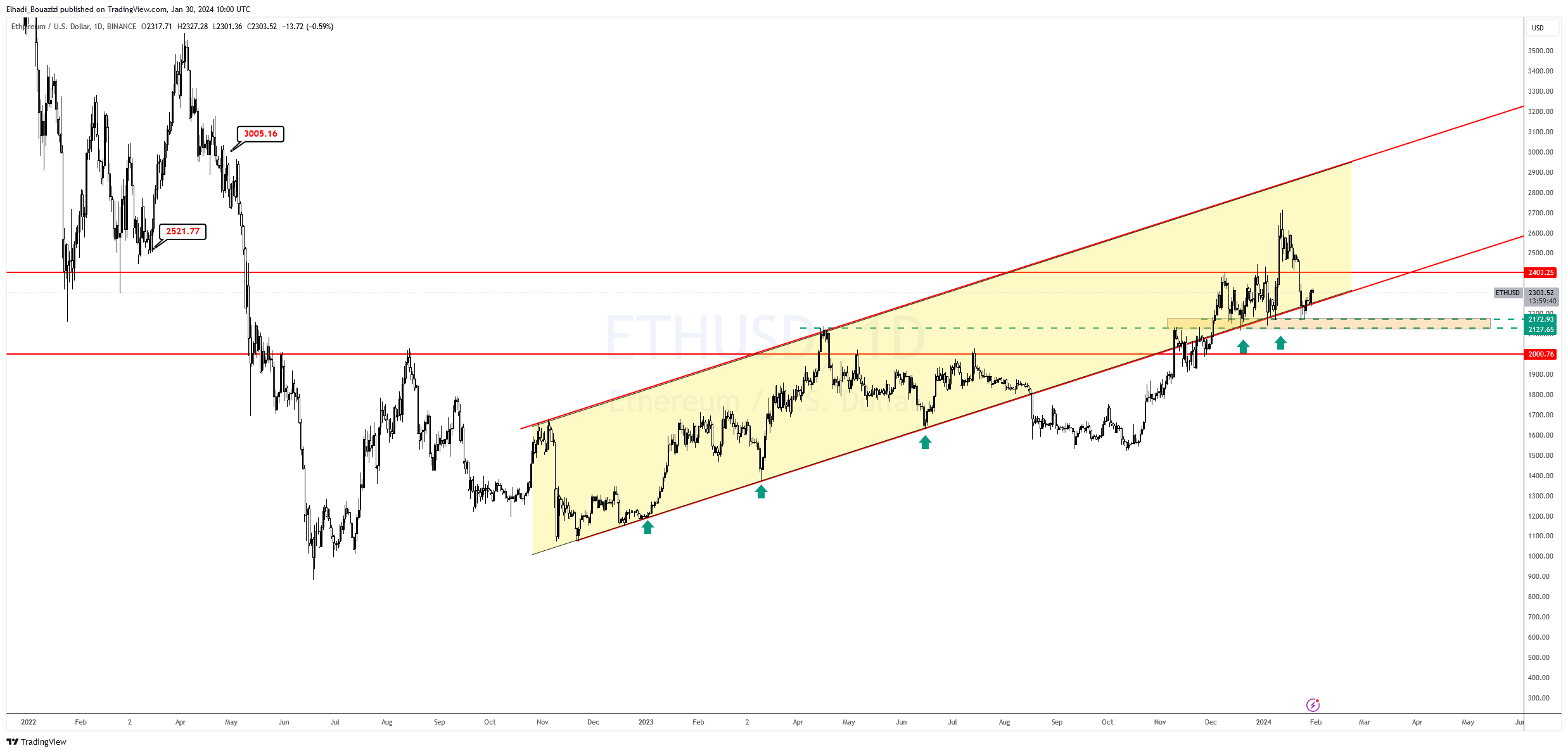 • سعر عملة ايثيريوم ETH لامس مستوى 2170 دولار قبل أن يرتد فوق خط الاتجاه الصاعد